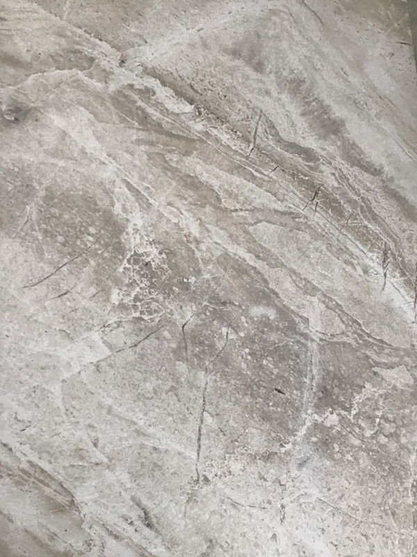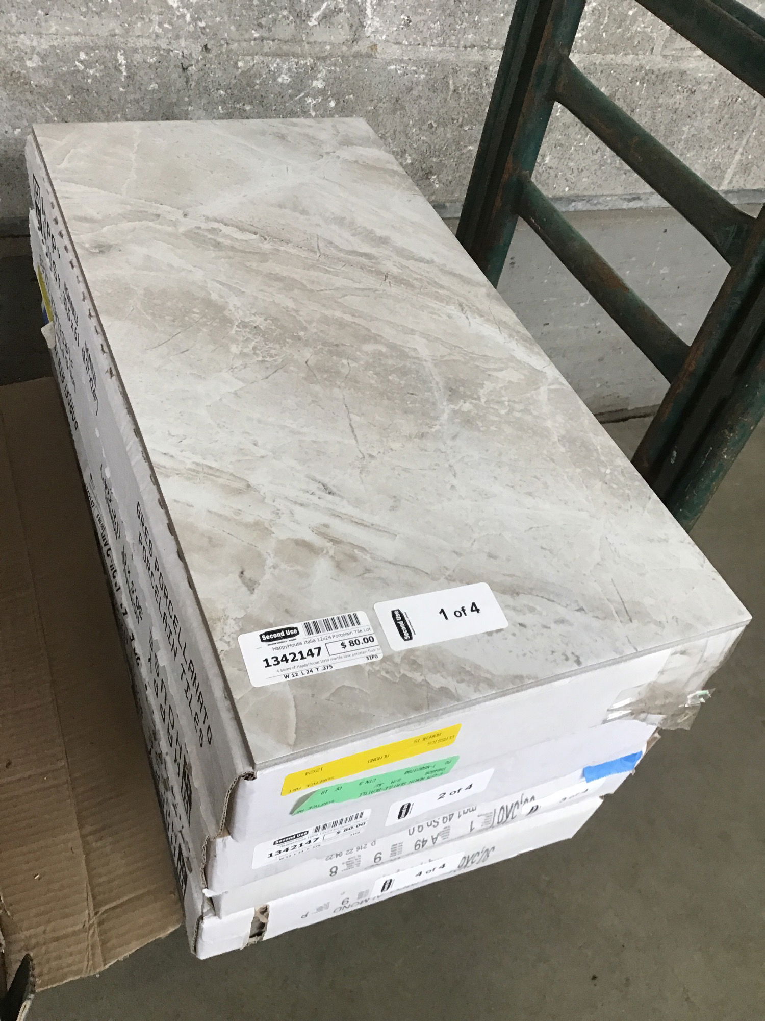 4 boxes of HappyHouse Italia marble-look porcelain floor tiles in "Olimpo Almond". Each box covers approx. 16sqft, for a total of ~64sqft in the lot.