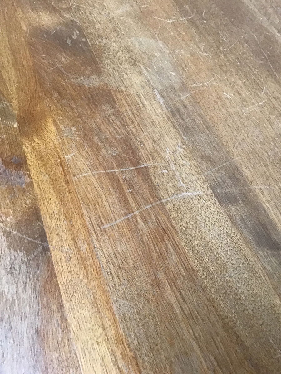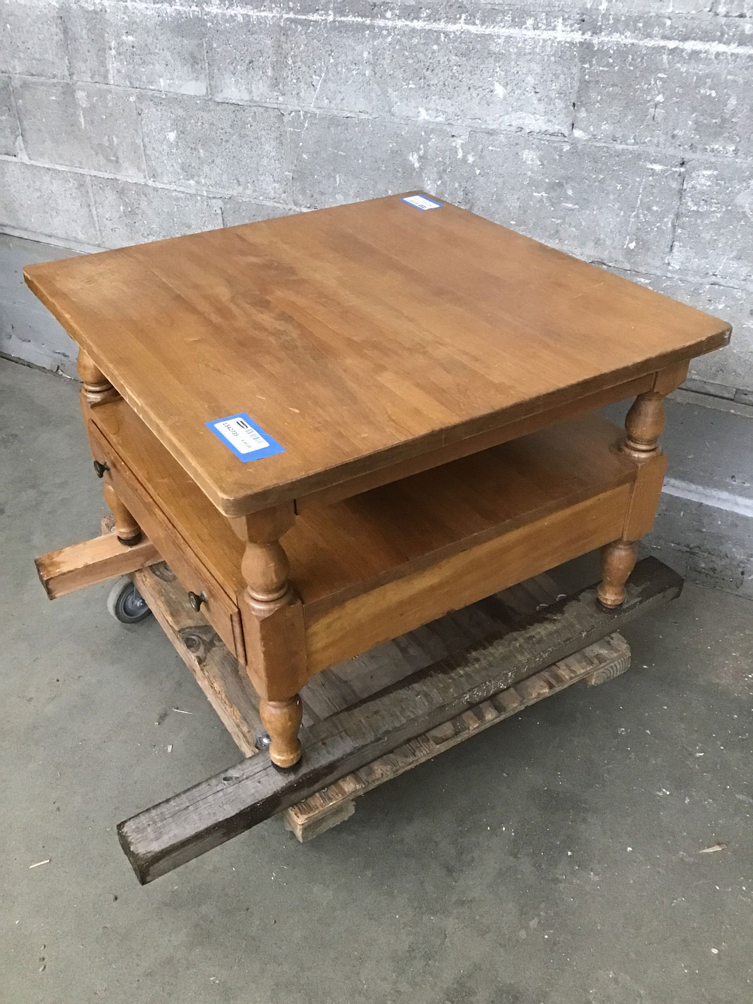 It's got 2 tiers and a single drawer. This square side table would look great by your bedside or next to a chair! Looks like Birch or maybe Maple. There are some scratches on top that look like they could be sanded out, but it's not too significant.