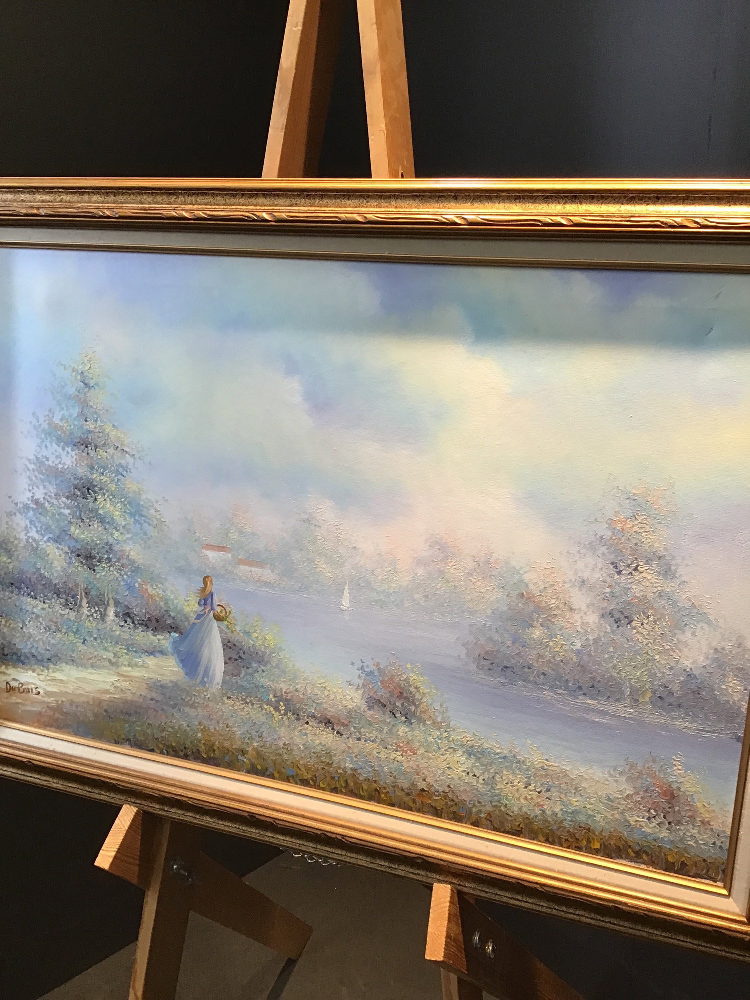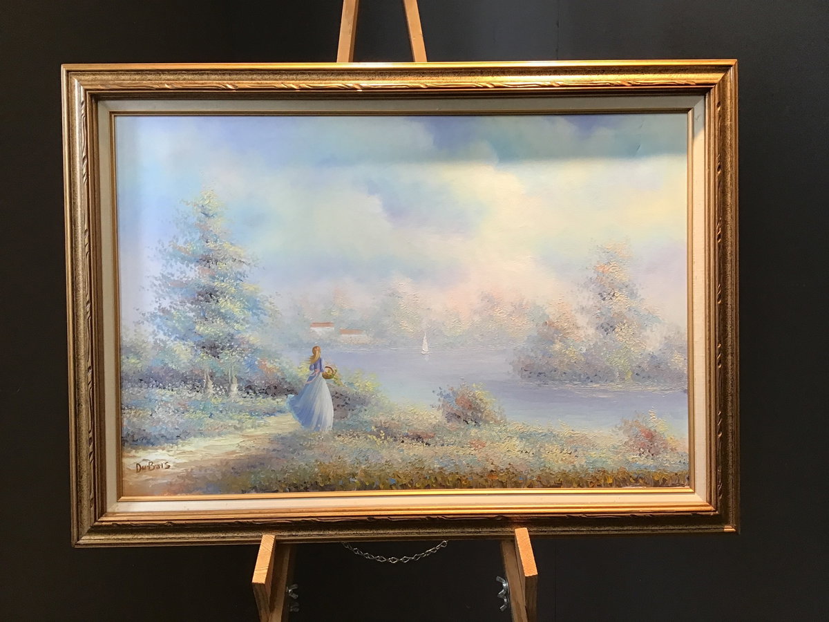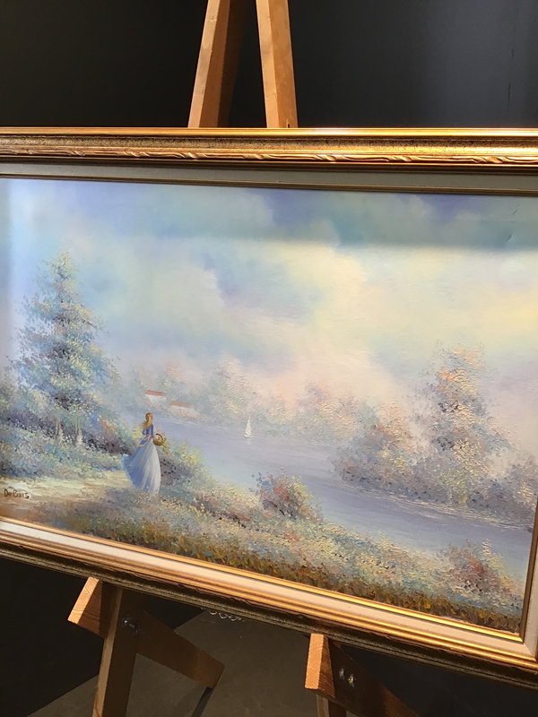 This painting is attributed to a "Henri Dubois" but research tells me this is most likely a pseudonym for a factory painter from the 1970s or 80s. It is still a really nice painting showing a lone lady seeming wistful by a lakeside. Pastel colors mixed with pointillist trees make for a very pretty scene. Decently sized and in a gold painted frame in great shape and signed by "Dubois" on the bottom left corner.