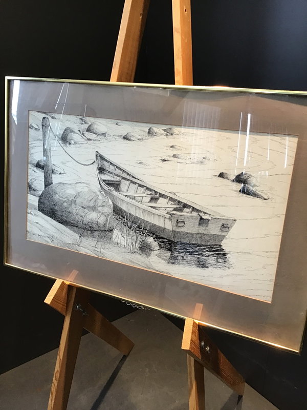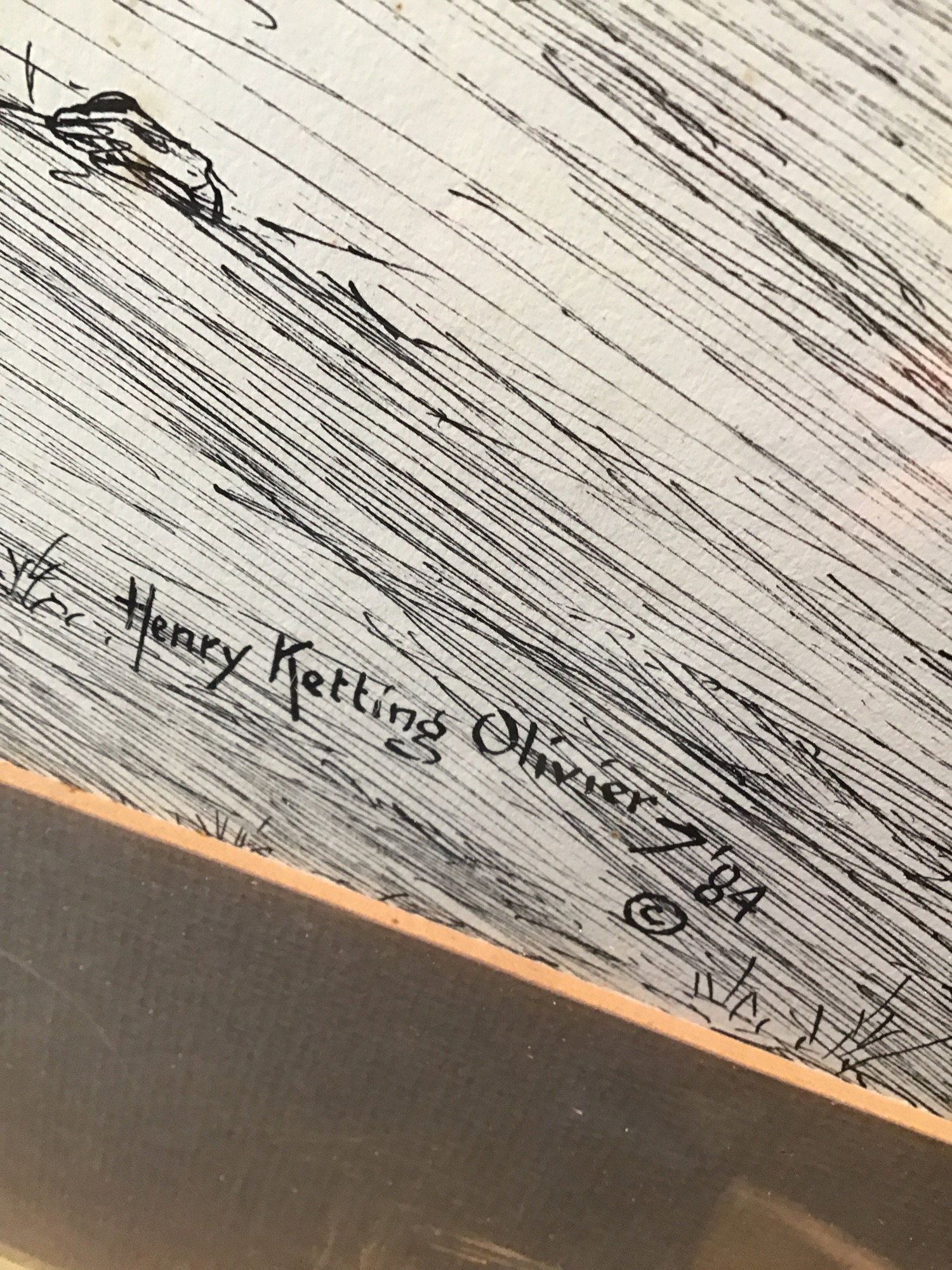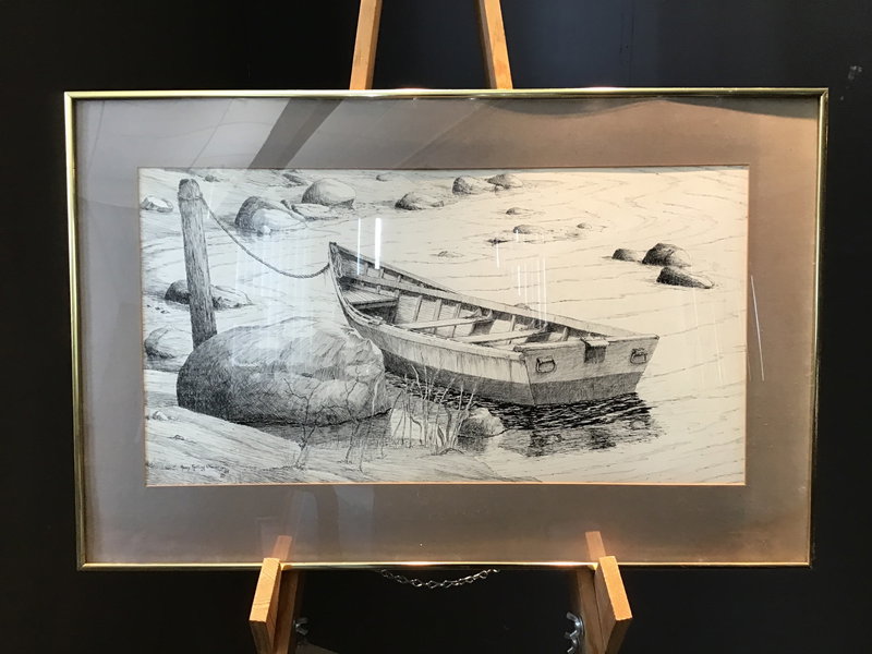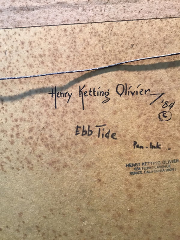 Henry Ketting Olivier was an artist known for his landscapes with ties around the world, he was born in Indonesia, studied in the Netherlands and the United States. He was a renowned art teacher for years after emigrating to California after WWII. This piece is an original in pen and ink titled "Ebb Tide" which depicts a lonely boat tied up to a post while the tide is in. Professionally framed and behind glass with a signature on the bottom left corner.