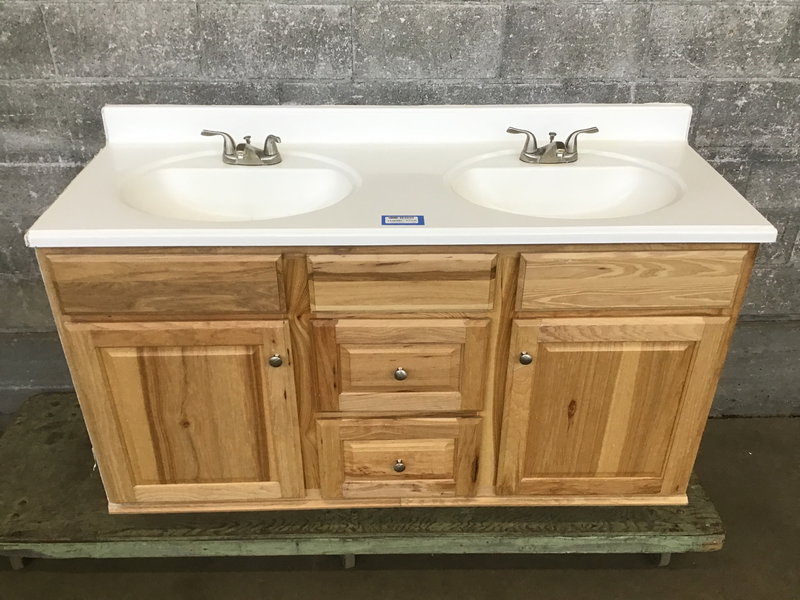 This is a double vanity base with a composite countertop that has two integrated sinks that have faucets and drains. The vanity itself is made from a beautiful hickory and that's just not something you see very often. Perfect if you want to have a rustic feel to your bathroom space.