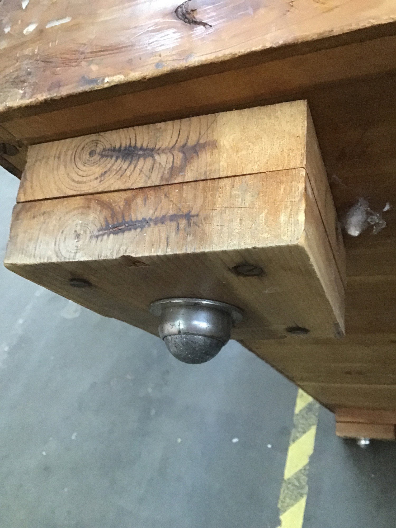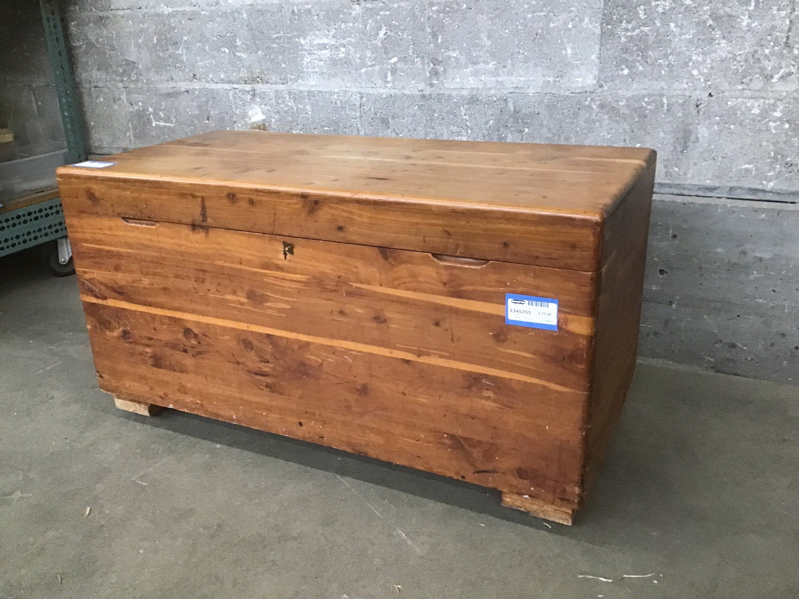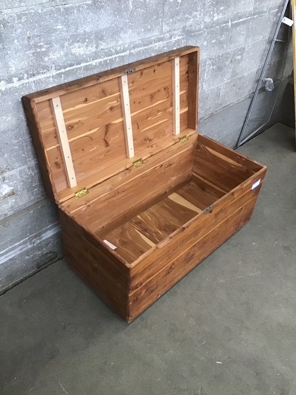Used, but still quite usable, homemade cedar chest that sports four ball style casters inserted into the feet. It won't roll nicely down the street, but it gives it enough mobility to move it around the room. Has a few dents and dings and a little wear to the finish, but still a solid trunk. There is not a key for the lock.