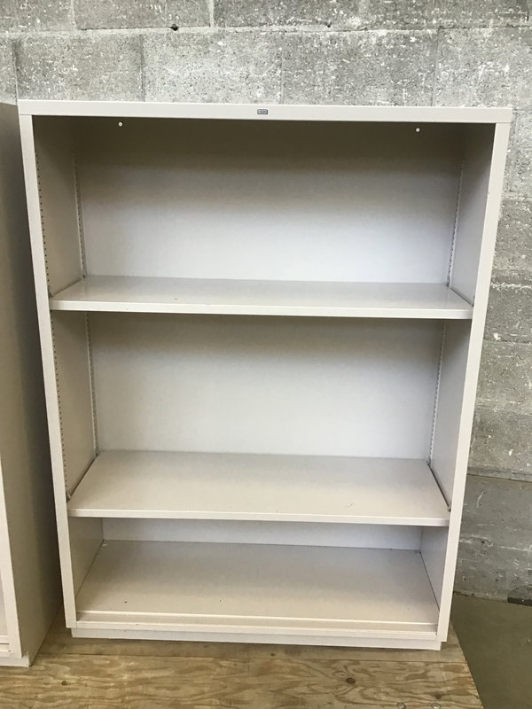 A solid metal storage shelf by reliable brand Hon. There are two repositionable shelves and the material has a grey beige painted finish. These would be great for work space storage.