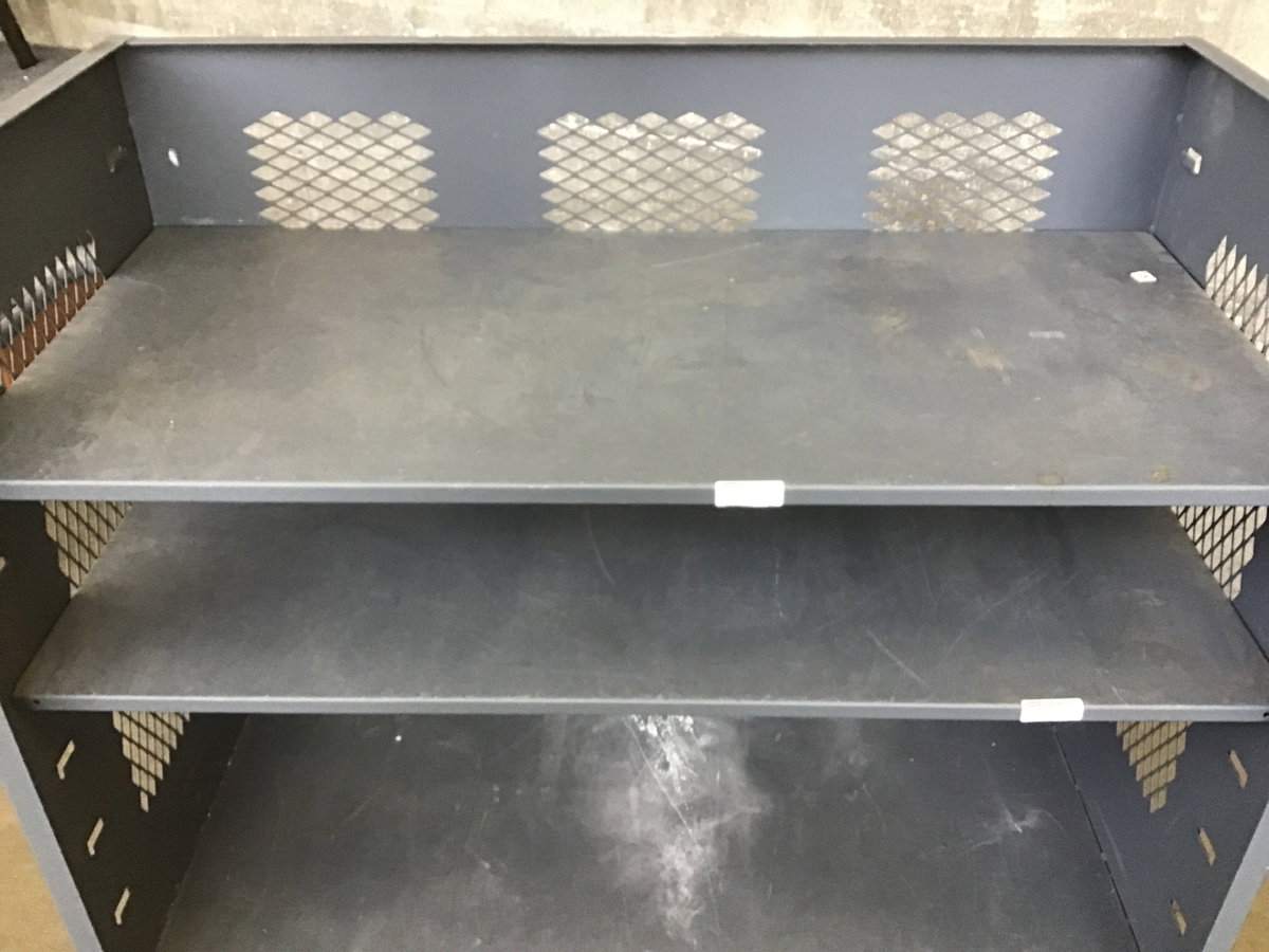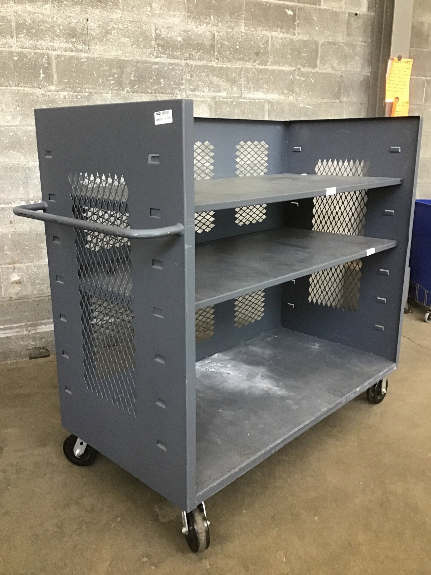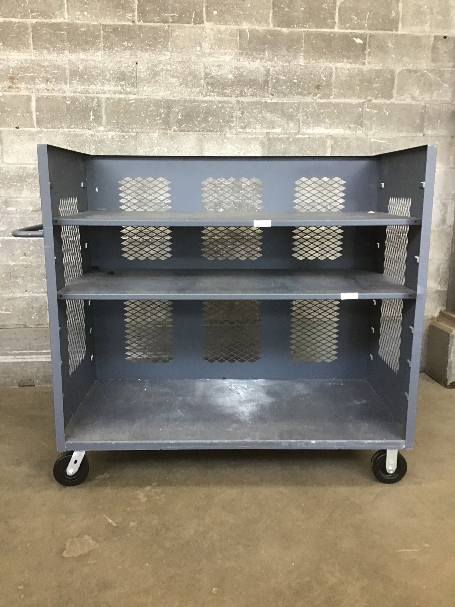 Heavy duty cart with three fixed sides and two adjustable shelves. Two casters are fixed and two swivel. Width listed includes steering handle.
