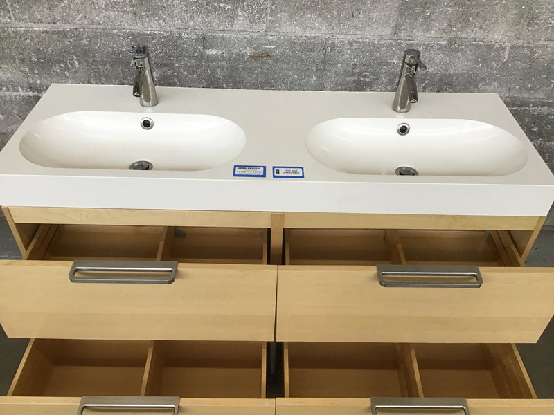 IKEA "Godmorgon" double vanity with composite sink and two faucets already installed. Drawers are spacious with removable dividers. Has adjustable legs to keep everything level. Note that counter is not attached to base. Height measurement is to top of counter, faucets bring it up to 42.5".