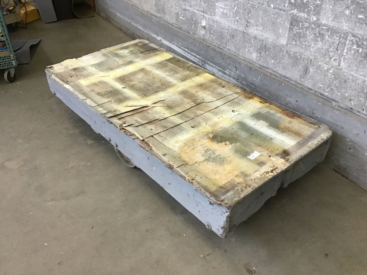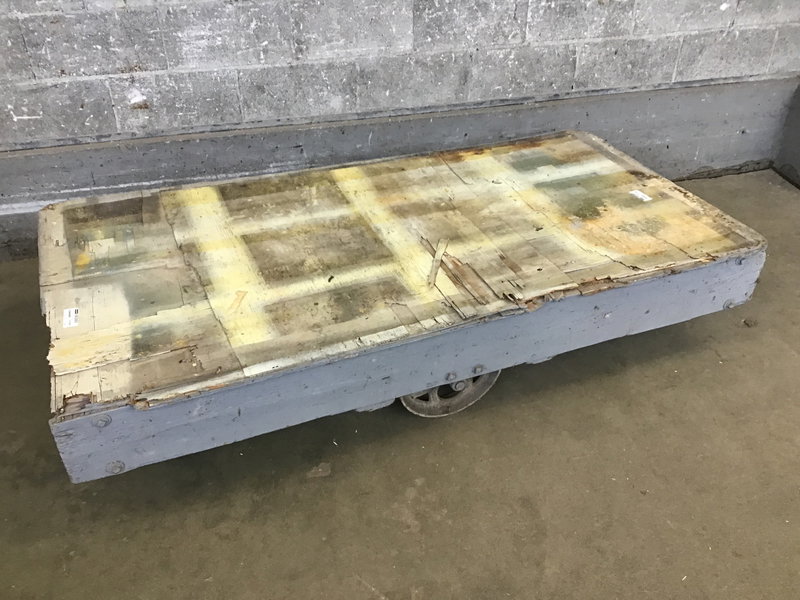 This is a weathered but still alive and kickin' industrial style flat cart that is wood with steel wheels. Wheels roll smooth but the wood top could stand to get replaced.