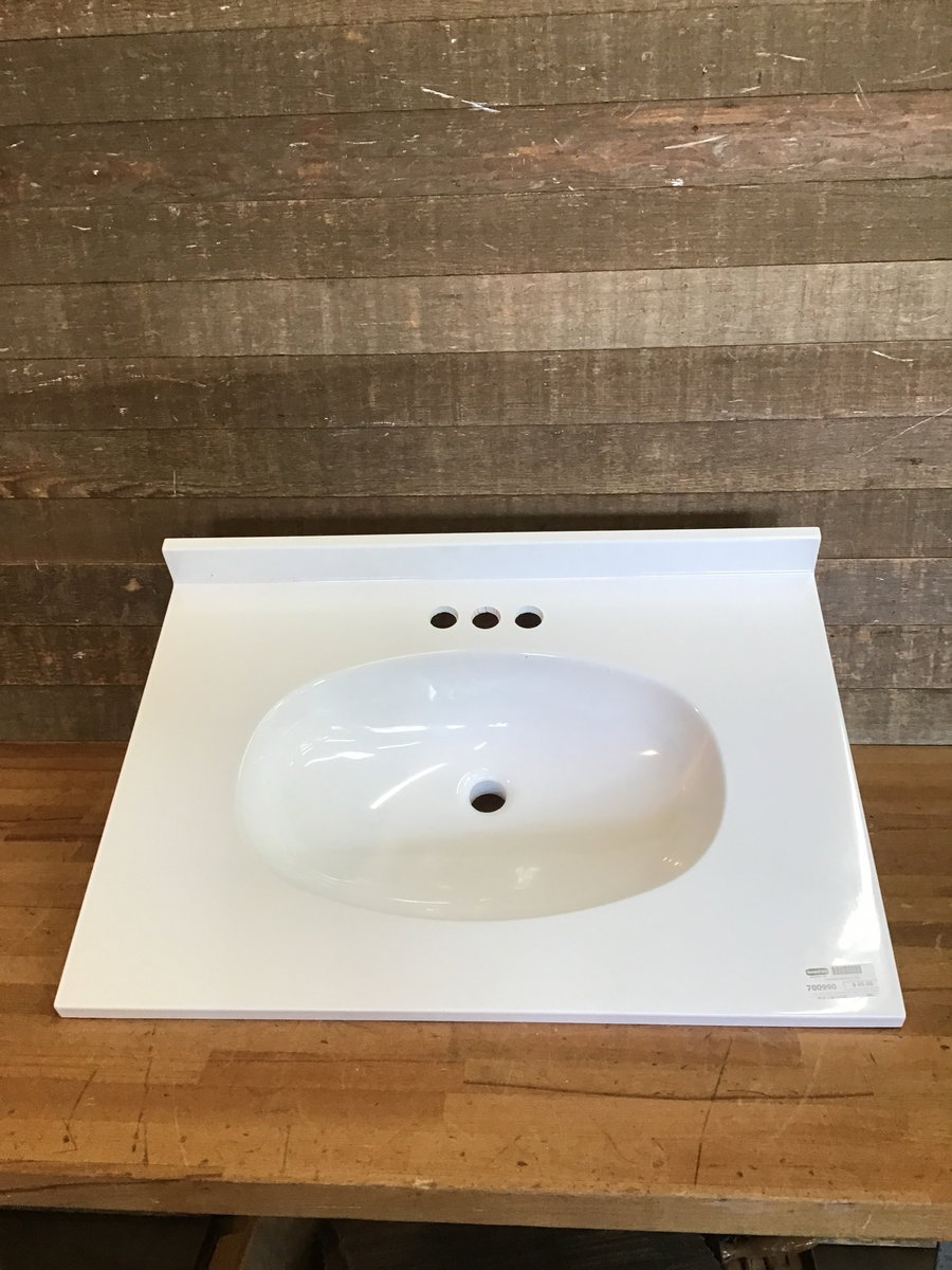 New, never used 31" Integrated bathroom vanity top by Project Source. This sells new at box stores for just under $100, see here for details. Ready to pop on top of a vanity base!