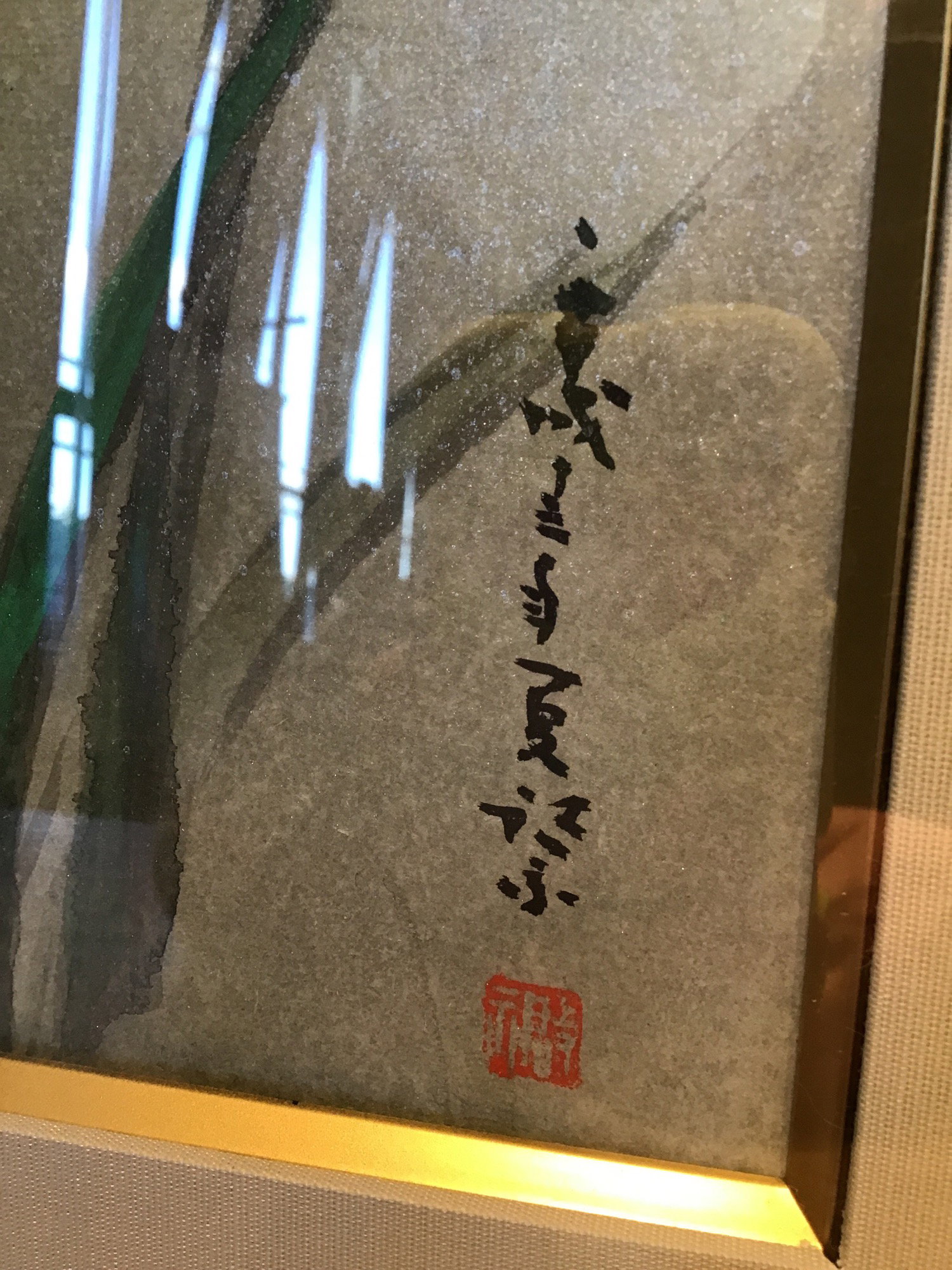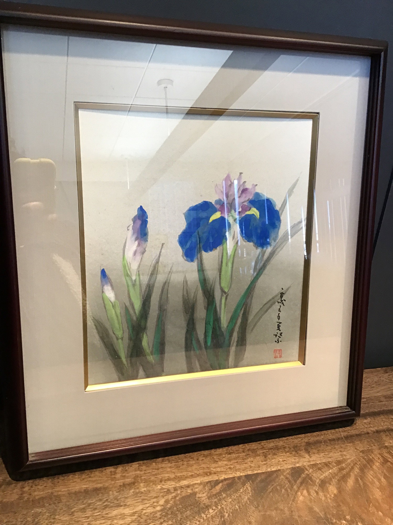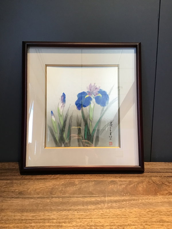 Pretty and nicely framed print of a Japanese watercolor of some blue irises. Border of the inside frame is a nice gold color and the frame is in great shape. Has a signature or something on the bottom right but of course it's in Japanese.