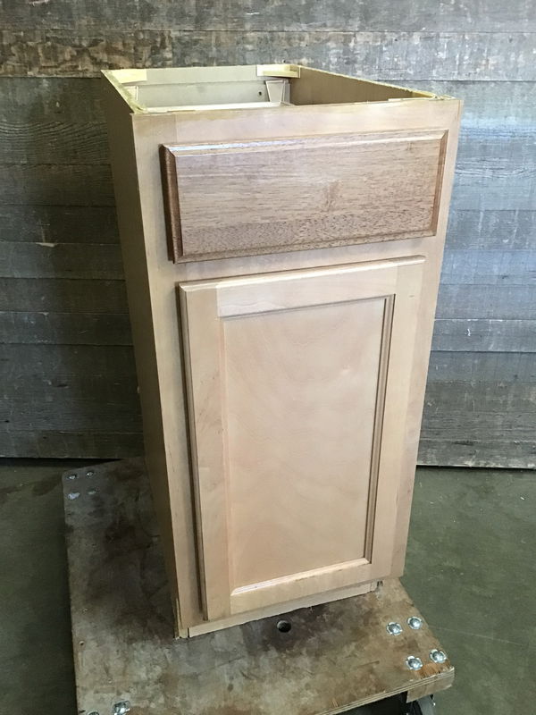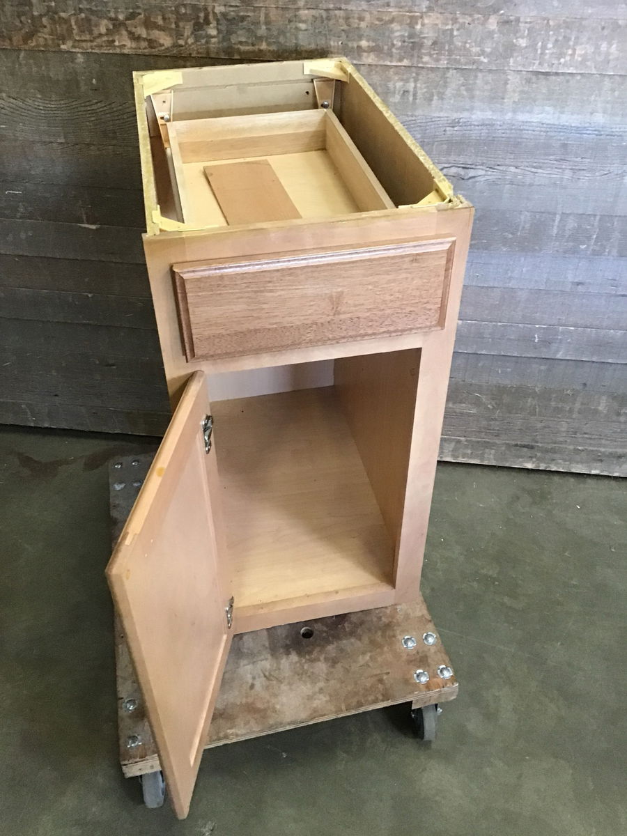 Kitchen base cabinet with a stained wood veneer. Has one door and one drawer, and the option for an adjustable shelf though one is not included. The drawer has a different wood face than the rest of the cabinet. Price reflects condition.