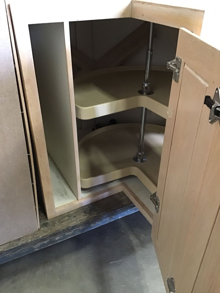Kitchen corner base cabinet in good, used condition. Has one bi-fold door with a two tier lazy susan, as well as a verticle cubby for sheet pans and trays. The toe kick base is inside the cabinet and would need to be reattached. May have some minor cosmetic damage.