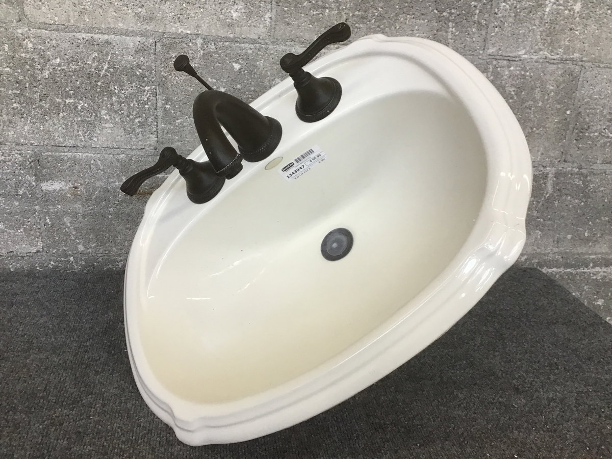 Kohler Bathroom Sink that comes with an oil-rubbed bronze faucet.