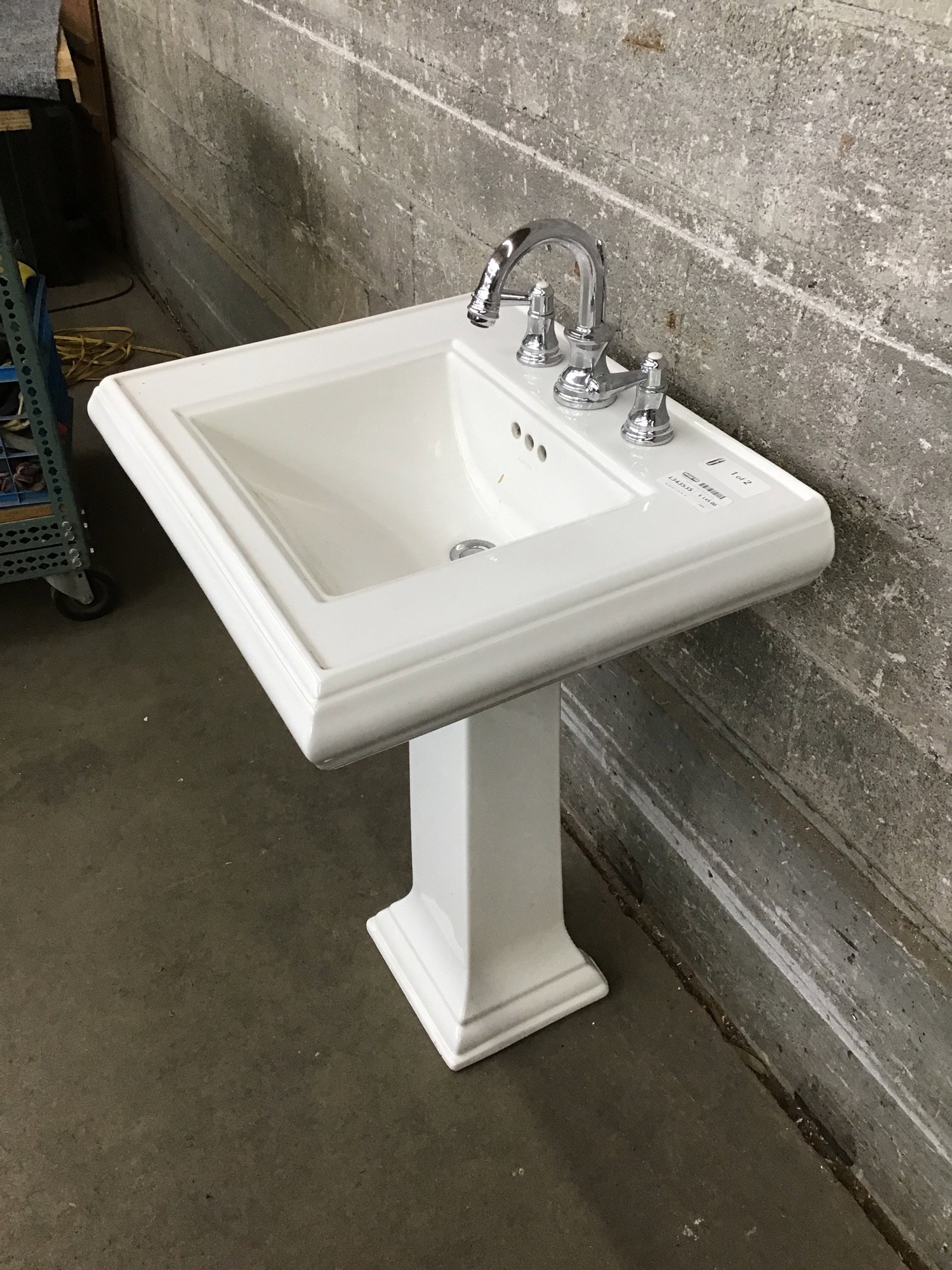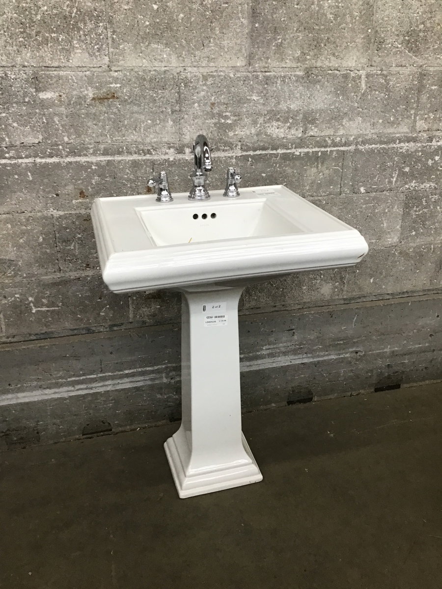 A Kohler Memoirs pedestal sink with a short gooseneck chrome faucet that looks to be in good, sturdy shape.