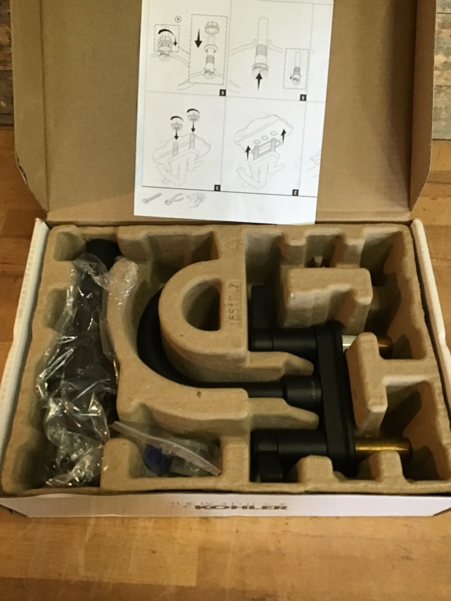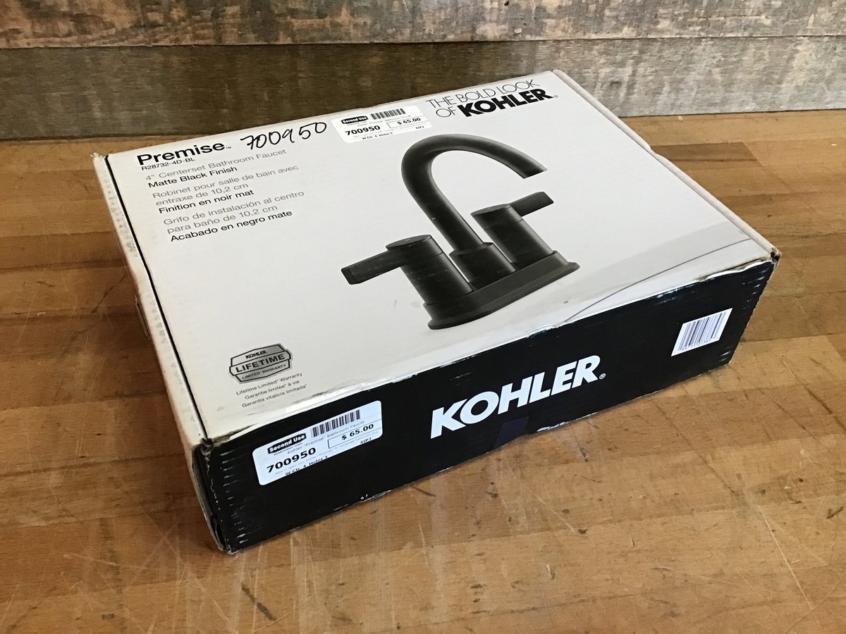 New in open box, Kohler "Premise" 4" centerset bathroom faucet with a matte black finish. This sells new at box stores for just under $130, see here for details.