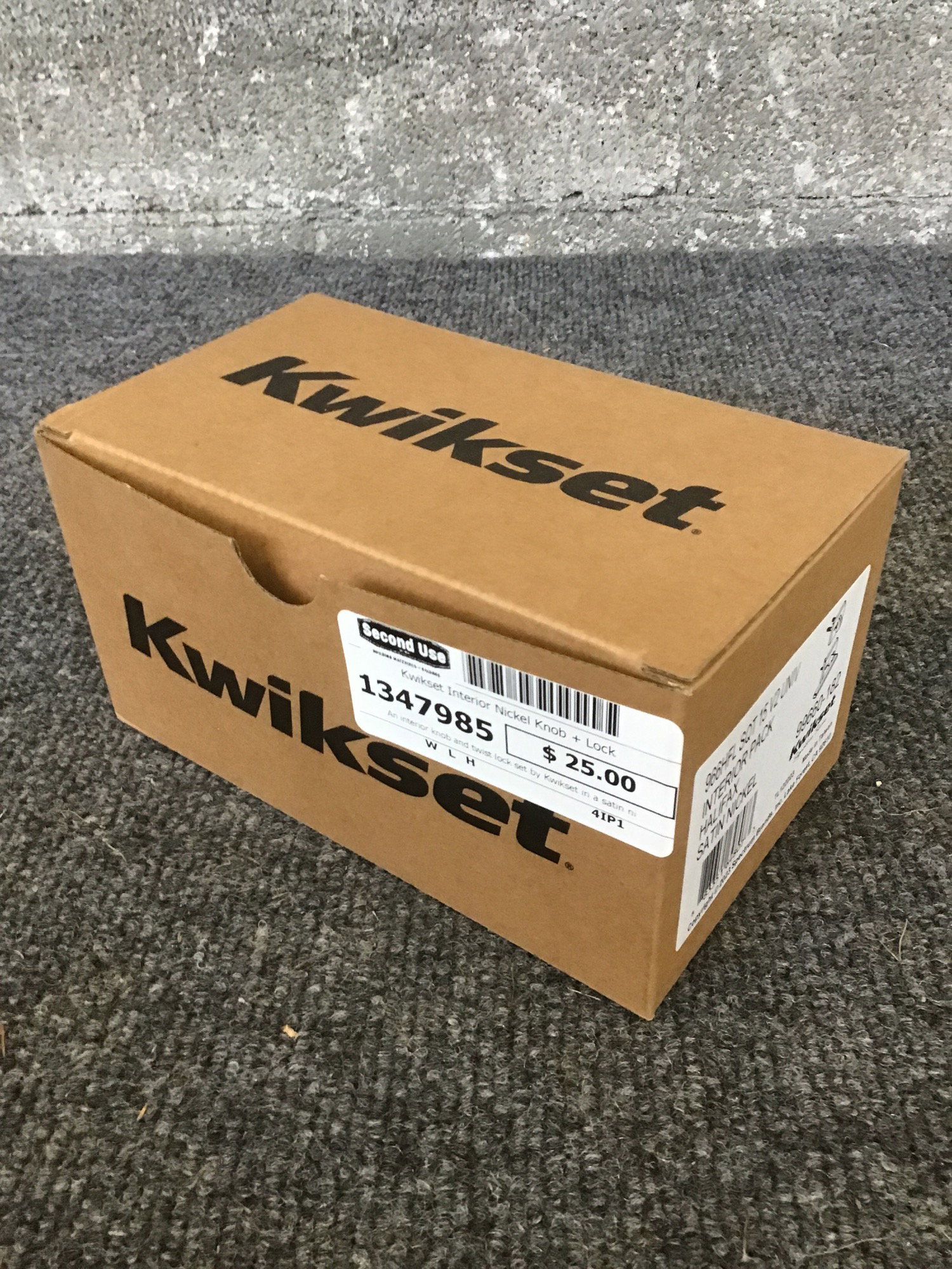 An interior knob and twist lock set by Kwikset in a satin nickel finish. Photo is representational. These look to retail new at $54.18.