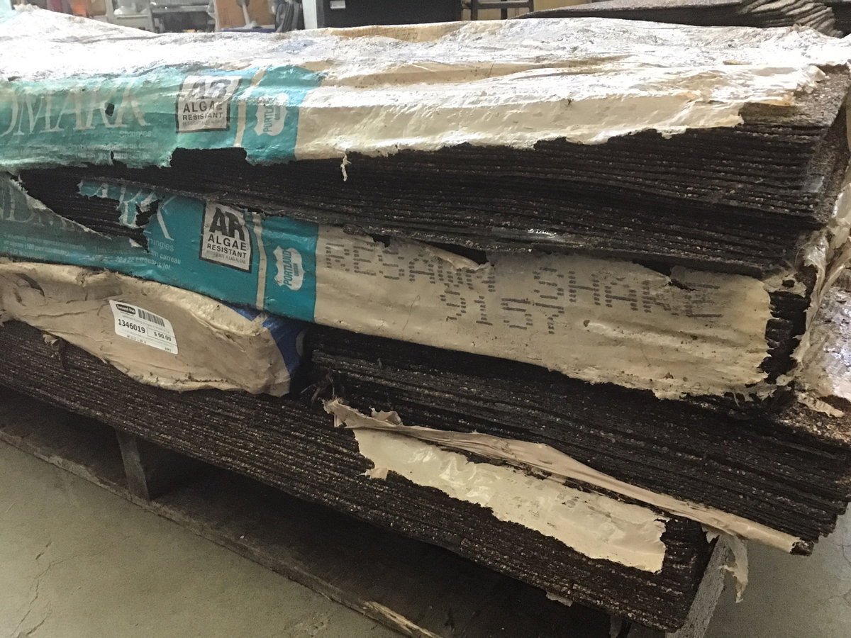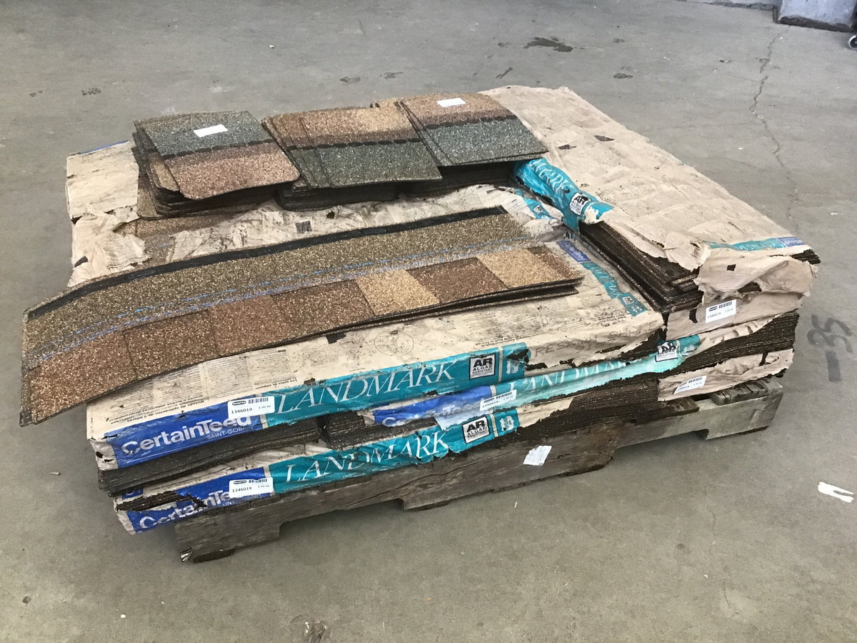 A lot of roofing shingles by Landmark in a sandy brown and tan color. There are a total of 12 bundles, 3 bundles cover 100 SF making for a total of about 400 SF of material. Also includes three smaller bundles of one of pieces.