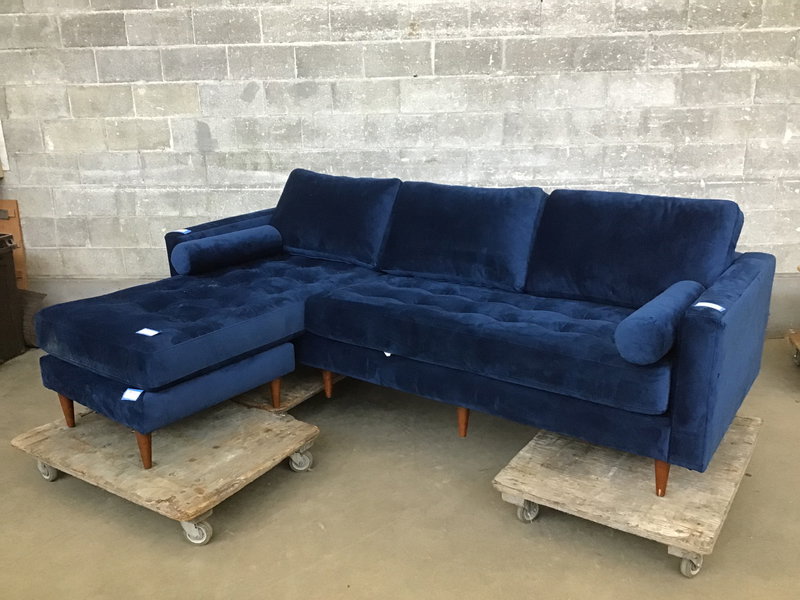 A larger sectional sofa in a velvety soft azure blue apolstered finish. Comes with two pillows and feels super soft to stretch out and recline on. A little dusty and some light staining