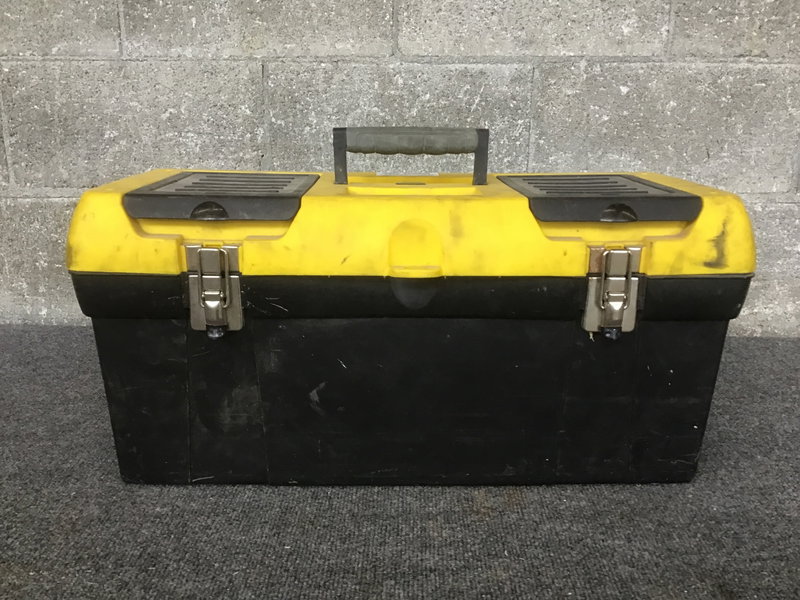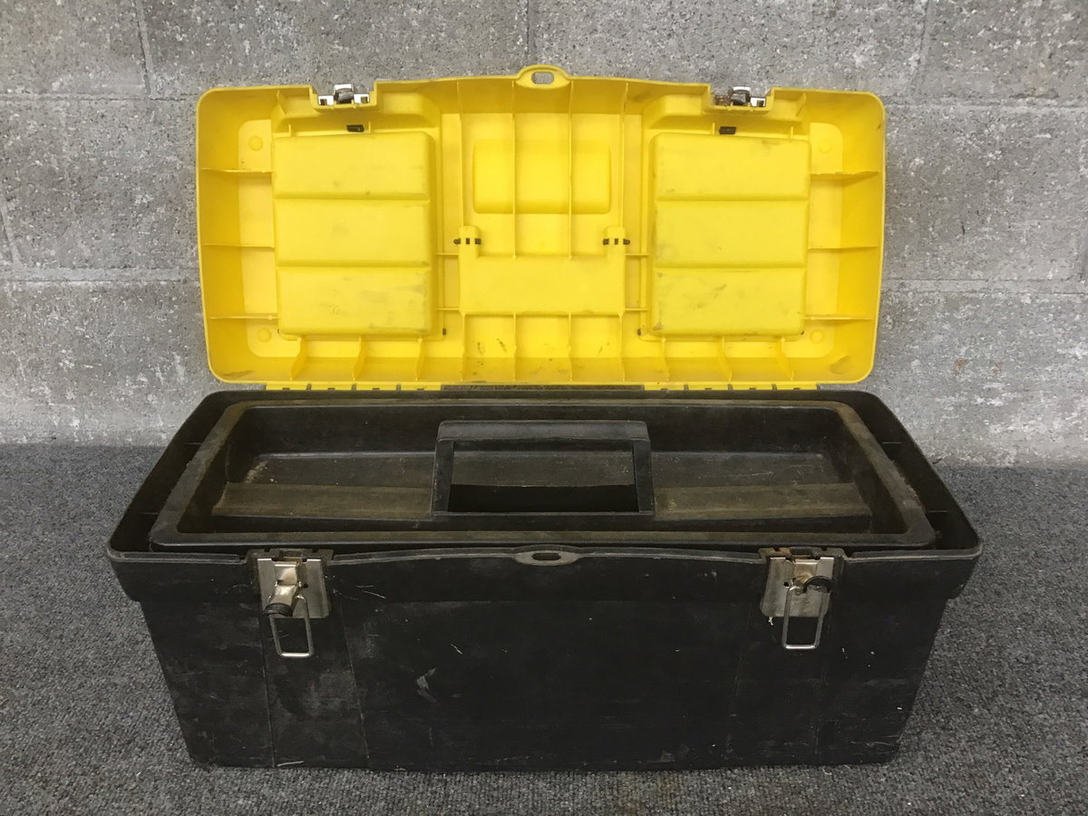 A larger Stanley tool box in yellow and black hard plastic. Includes an inner removable tray and two bins of storage on the outer top side.