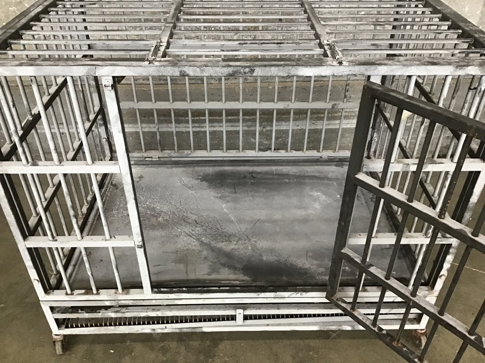 For the bigger pet buddies here we have a large metal domestic animal kennel. Each kennel has a plastic tray at the base, a door to shut and a set of rolling casters for ease of moving. Photo may be representational.
