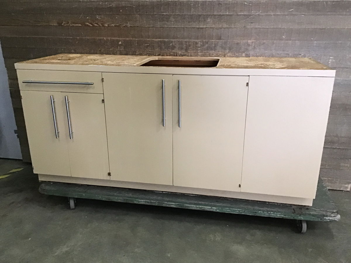 Vintage laundry room base cabinet with a blind corner. Made with a particle board box. Four doors and one drawer, all with newer brushed nickel pulls. The left two doors has one adjustable shelf included. There is a sink hole cut in the top that has a rough opening of 20.5"W x 19.5"D. Shows some wear, but is overall in good sturdy condition. Great for another laundry room, or use in a workshop!