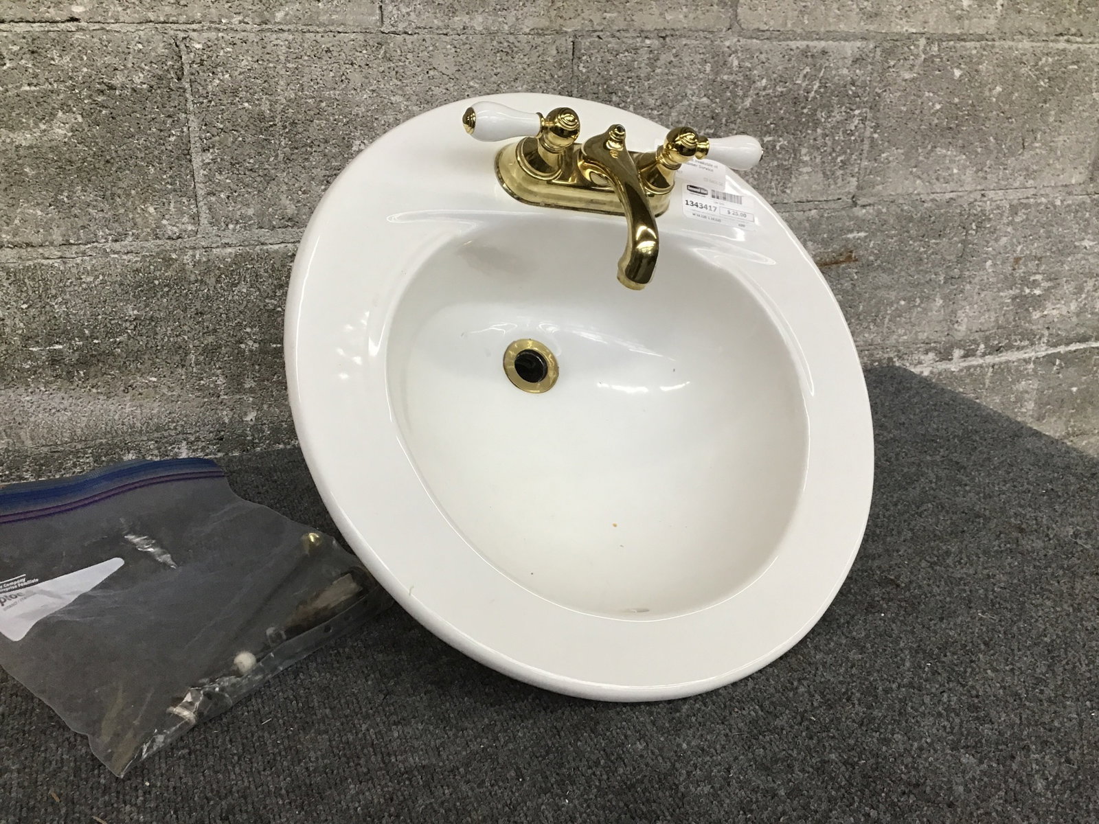 A bathroom sink that looks to be in good shape, complete with a brass and porcelain faucet.