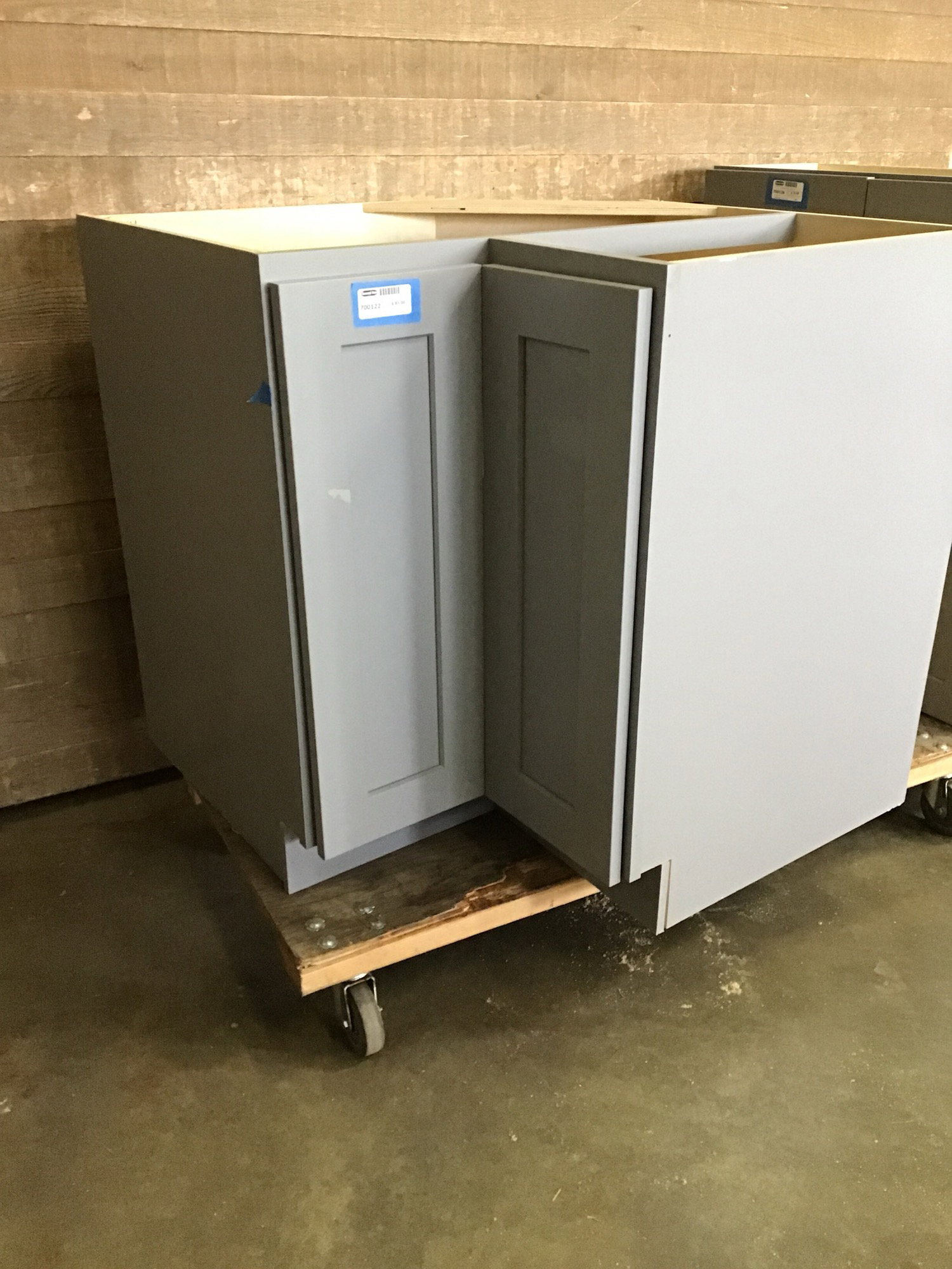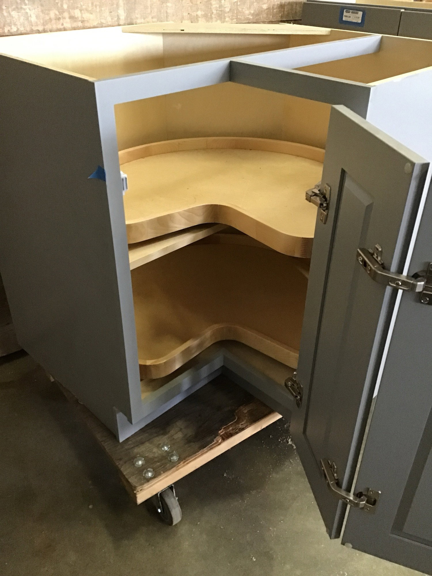 Never installed, grey lazy susan base cabinet with 2-shelf pie-cut shelves. No signs of damage!