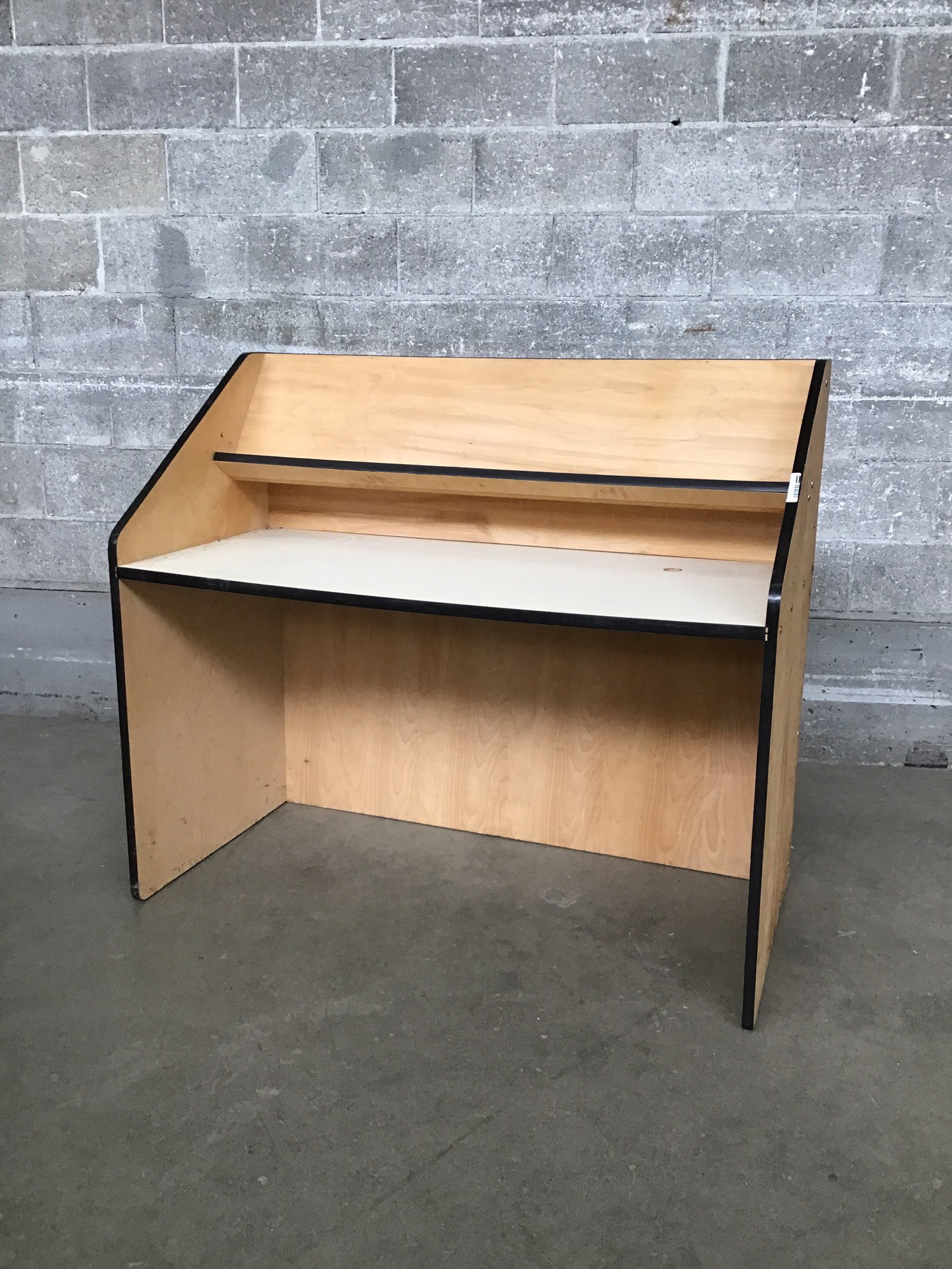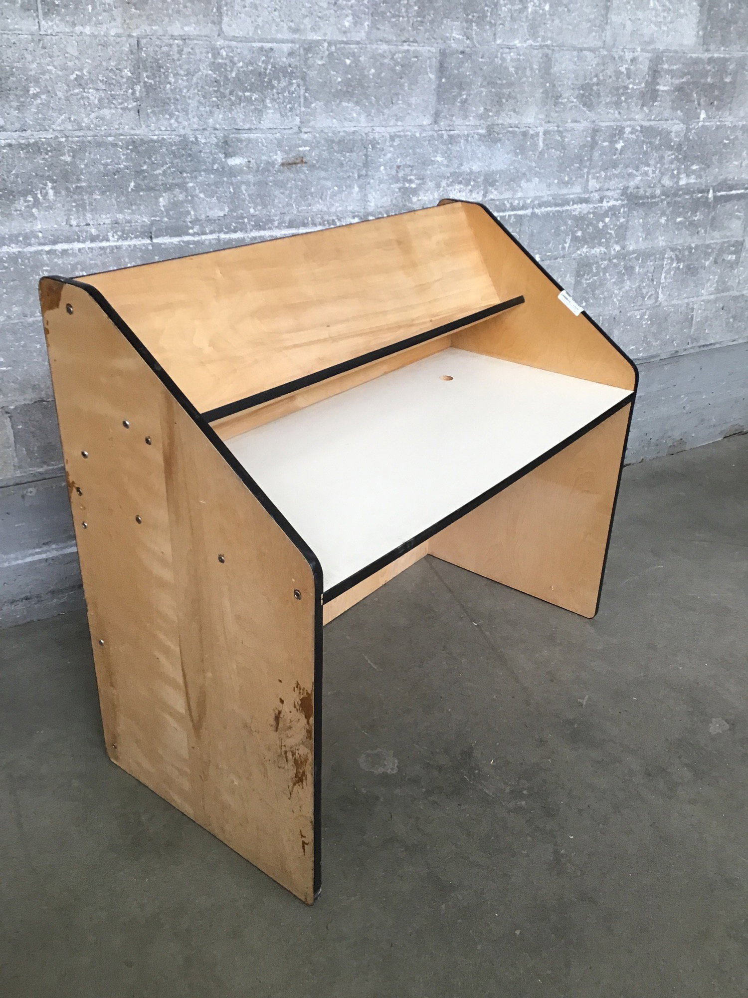 Looks like this was a computer station or privacy desk at a library or school. The frame is plywood and the desk top has a laminate veneer. Desk height is 27".