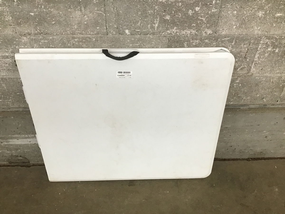 A fold up event table made by Lifetime featureing a white surface and dark grey table legs.