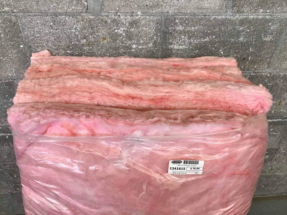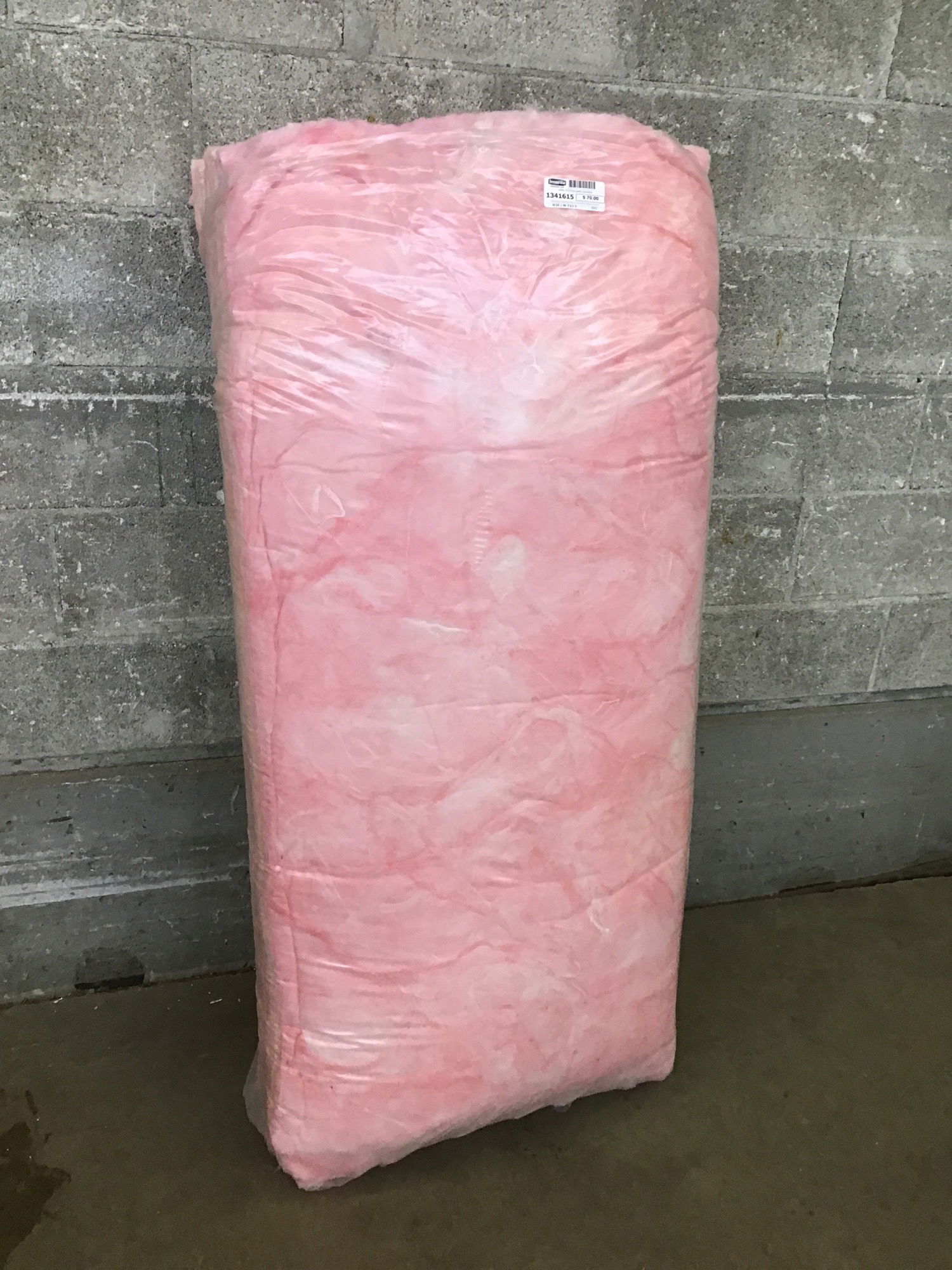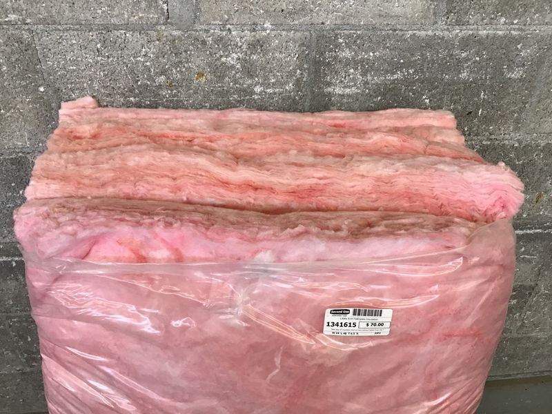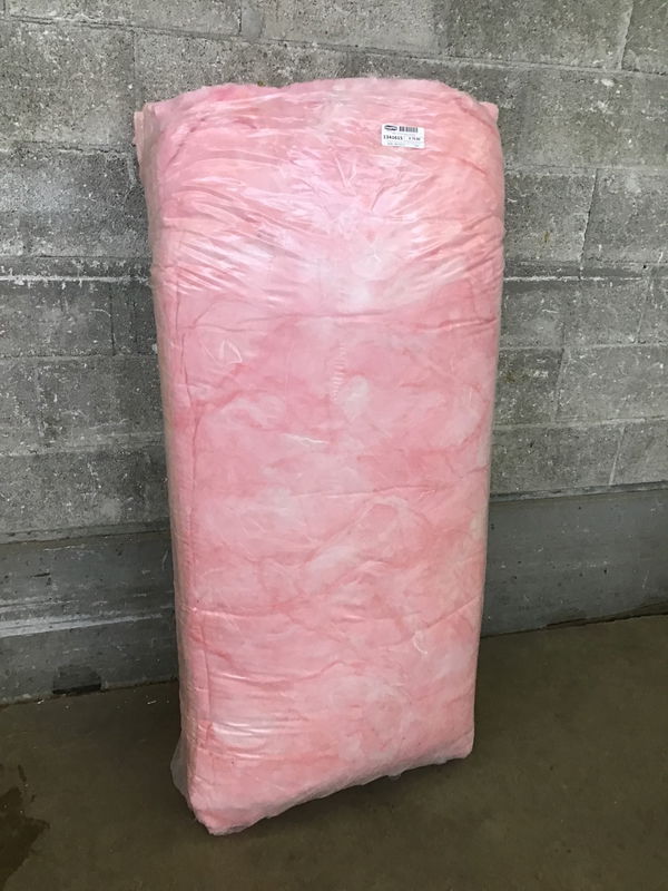 New bag of insulation that arrived without labels from the factory. Bag contains ~48 SF of coverage and is likely R19 based on the batt thickness.