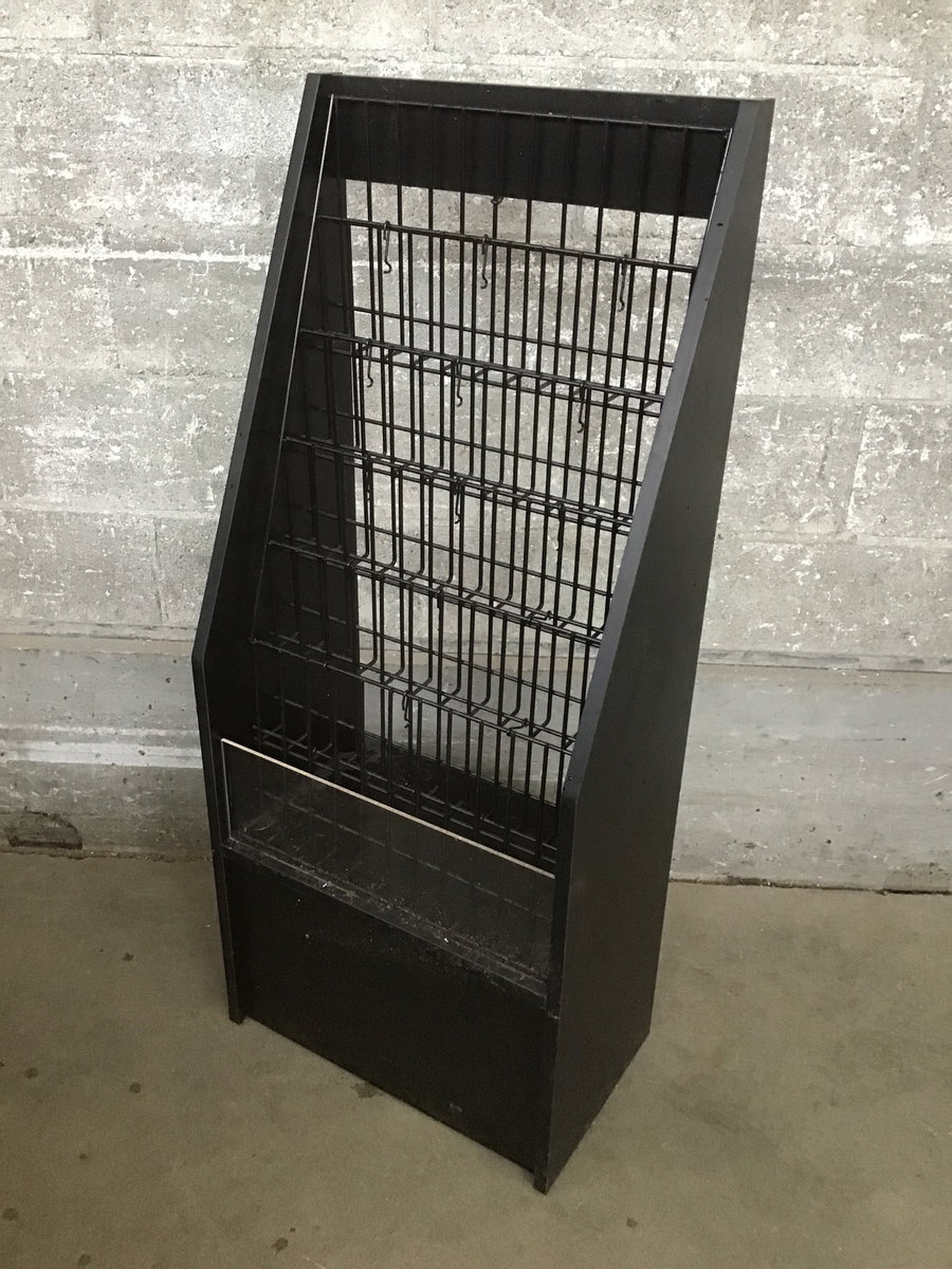 A simple magazine rack made of wire shelving, laminated particle board, and a piece of acrylic. Has six "shelves" for magazines, brochures, flyers, or whatever else you need to distribute.