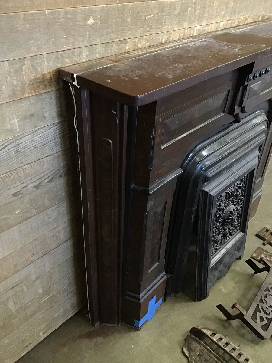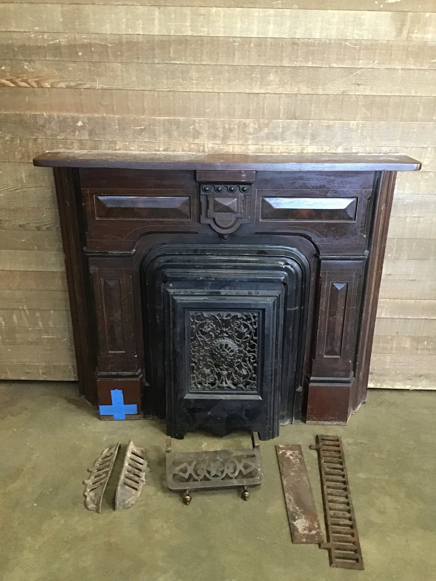 A magical vintage steel full surround fireplace mantel. Surround is made of steel but mantel shelf is made of stone. It measures at 52" W x 10" D X 1" thiCK! Includes an incredible door and log cradles. Surround does have a crack but can be welded if you're cool! The more you get to know this piece the more you'll love it and feels its magic.