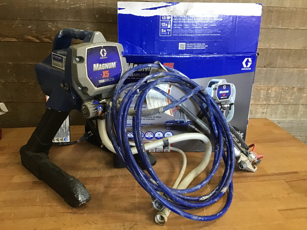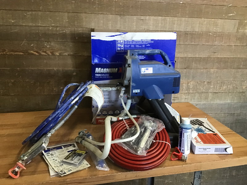 Magnum X5 true airless paint and stain sprayer. Powered on in house and appeared fully functional. Comes with extra hose and spray nozzle, as well as instructions and priming liquid.