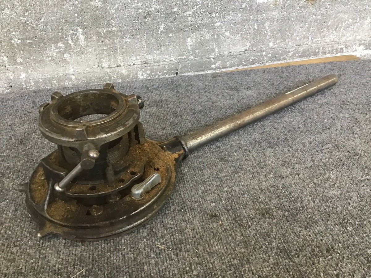 A manual pipe threader by the Ridge Tool Co., no. 65-R, which threads 1" to 2" pipe.