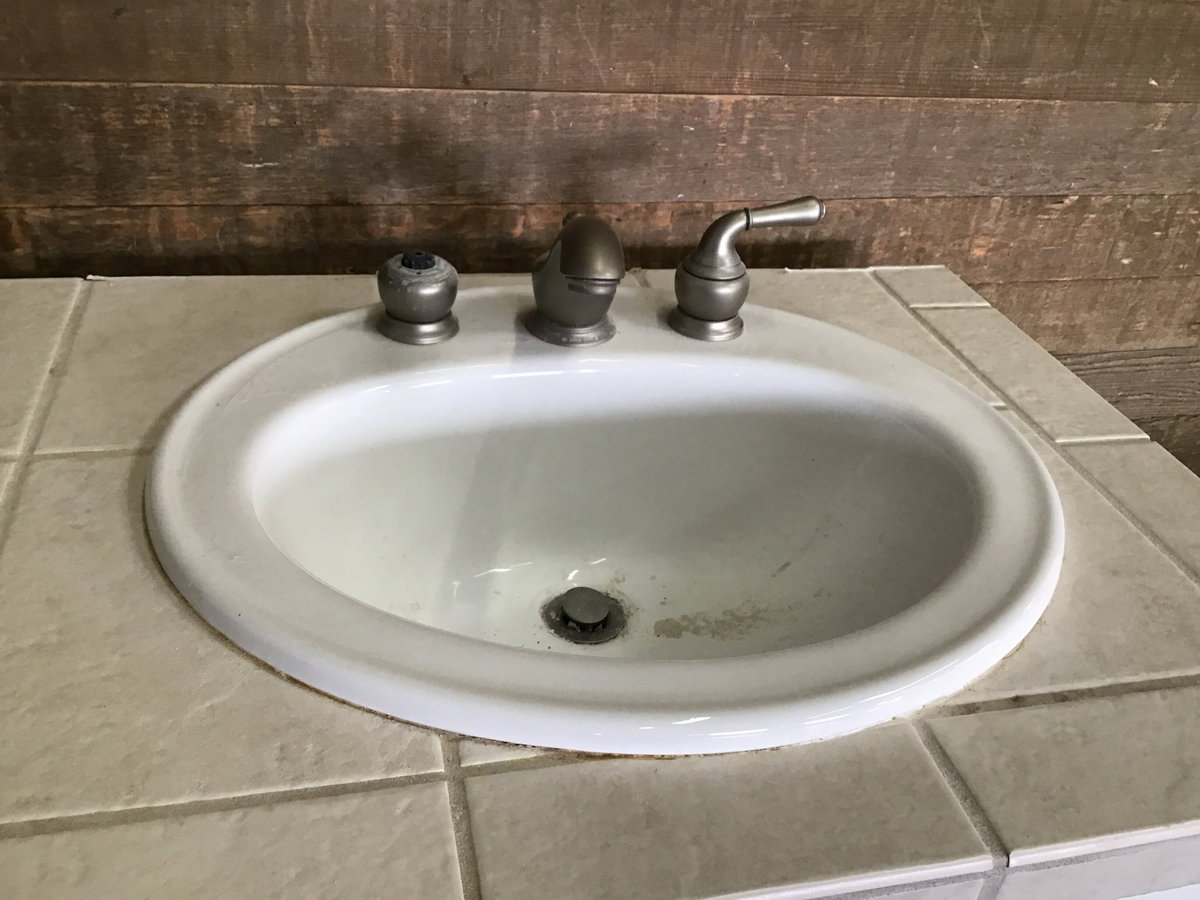 Sweet maple bath vanity base with particle board box construction. face has painted white. Features 3 drawers, 2 doors, a kohler sink and moen faucet that should be replaced. Countertop is constructed of plywood and tile. Height listed is for cabinet alone. Some minor superficial water damage underneath sink (pictured) but cabinet is in overall good sturdy condition!