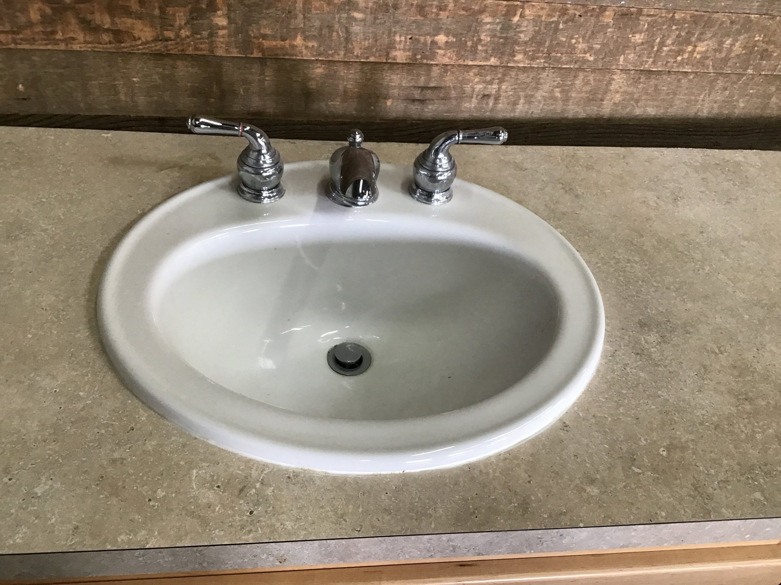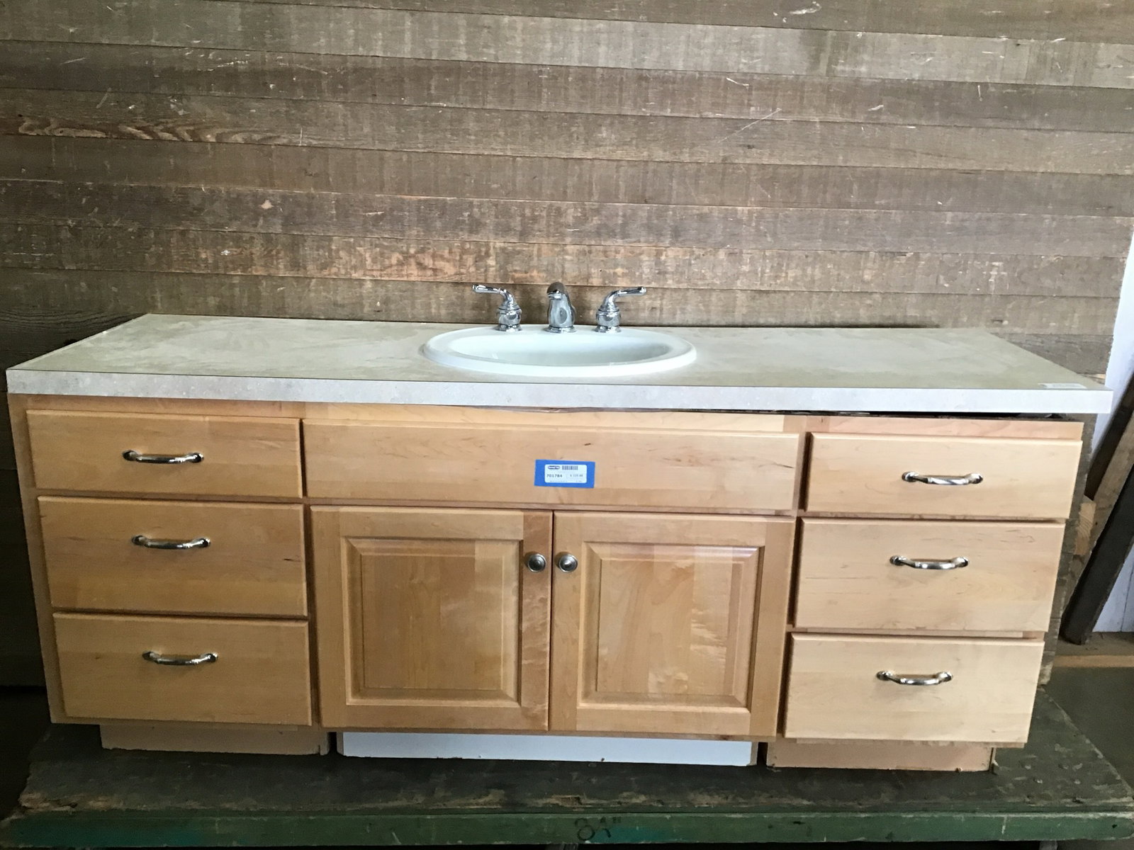 Sweet maple bath vanity base with particle board box construction. Features 6 drawers, 2 doors, a kohler sink and moen faucet. Countertop is constructed of particle board and a vinyl sheet. Some minor superficial water damage underneath sink(pictured) but cabinet is in overall good sturdy condition! Please not countertop is not attached.