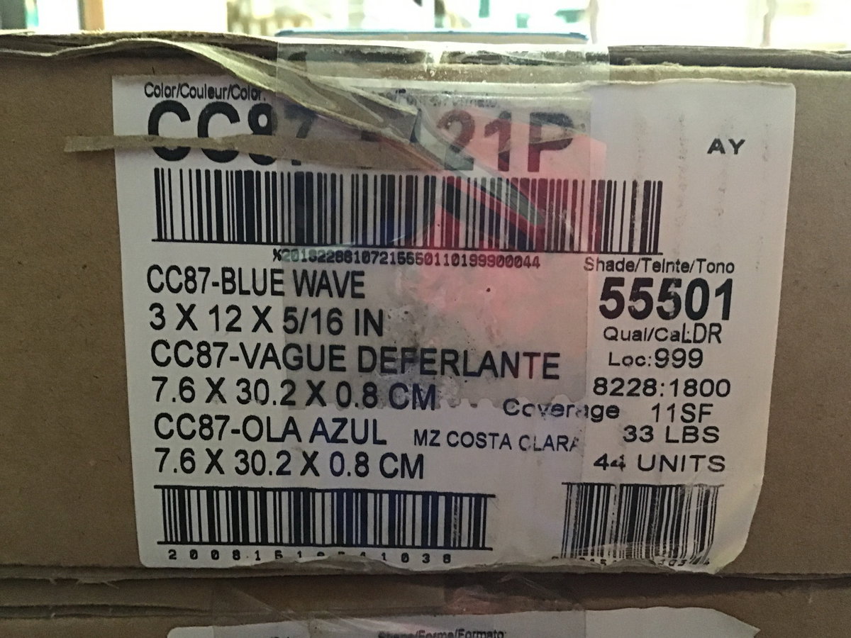 Lot of Marazzi Costa Clara 3"x12" wall tile in color tone "Blue Wave". There are four complete boxes of 44 tiles and one partial box of 37 tile, for a grand total of 69.25 square feet of coverage. This tile sells new at over $8 a square foot, see here for details.