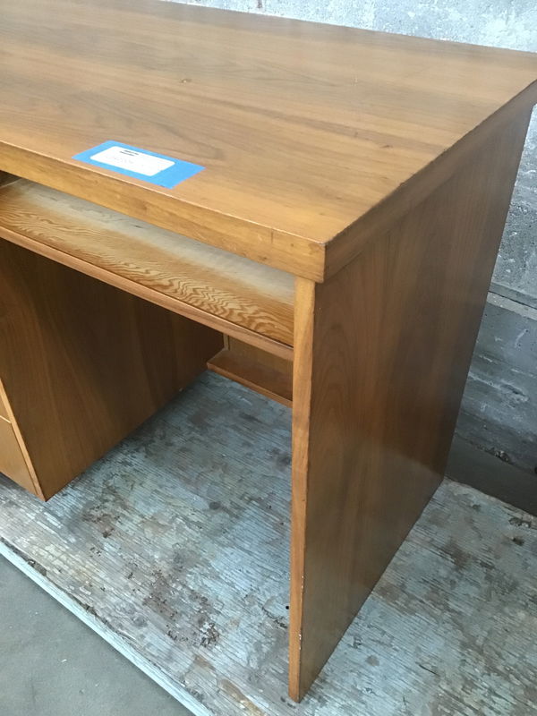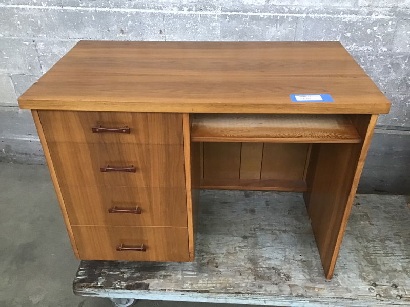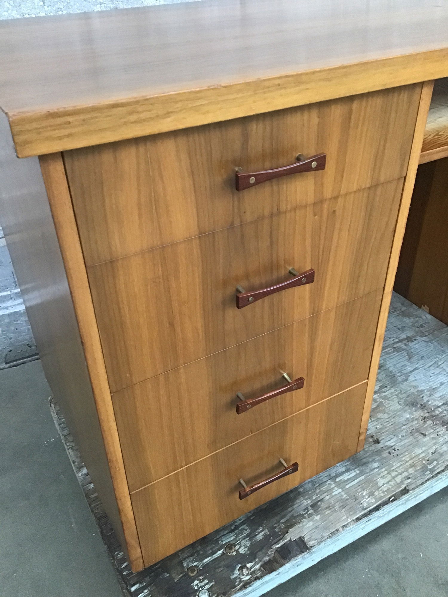 This is a really neat home-built (I think) midcentury modern desk with teak veneer and beautiful rosewood and brass pulls. It has 4 drawers for lots of storage with an open space (which probably lost its drawer in the dawn of the keyboard era) for flat storage. It has signs of 50 years' worth of handling, but it's really well built and in great condition overall!