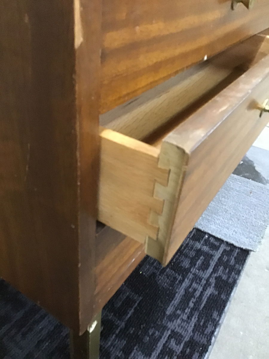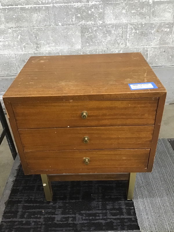 This Mid Century Modern side table features three drawers for storage, alluring wood grain and looks to have been made by American of Martinsville. Its got a few cosmetic issues but otherwise is very handsome and would add a flair of sophisticated style to any bedroom or living room.
