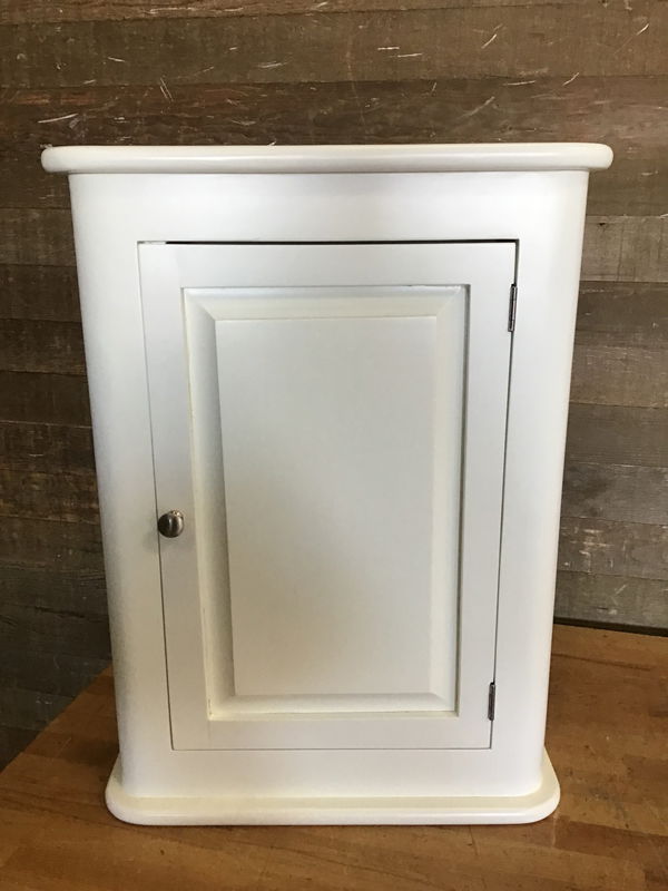 Wall mounted bathroom storage cabinet. Made of wood and in solid used shape. Does not come with adjustable shelves even though it has the holes for it. Could use a repainting.