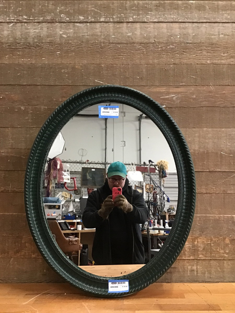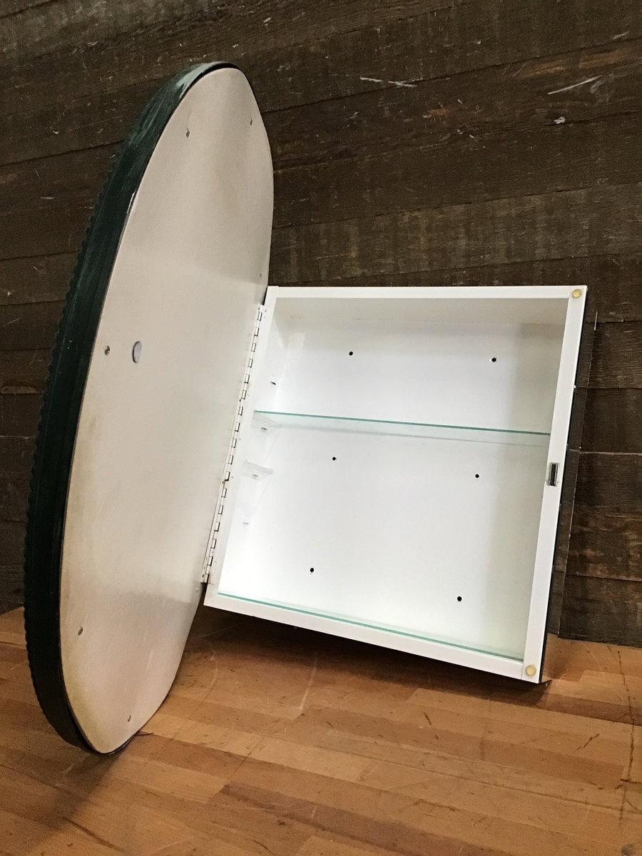 Mirrored medicine cabinet with plastic frame heavily painted with green. Paint job is a little rough and was over sprayed into the mirror so will need to be scraped off. Has two internal adjustable shelves.