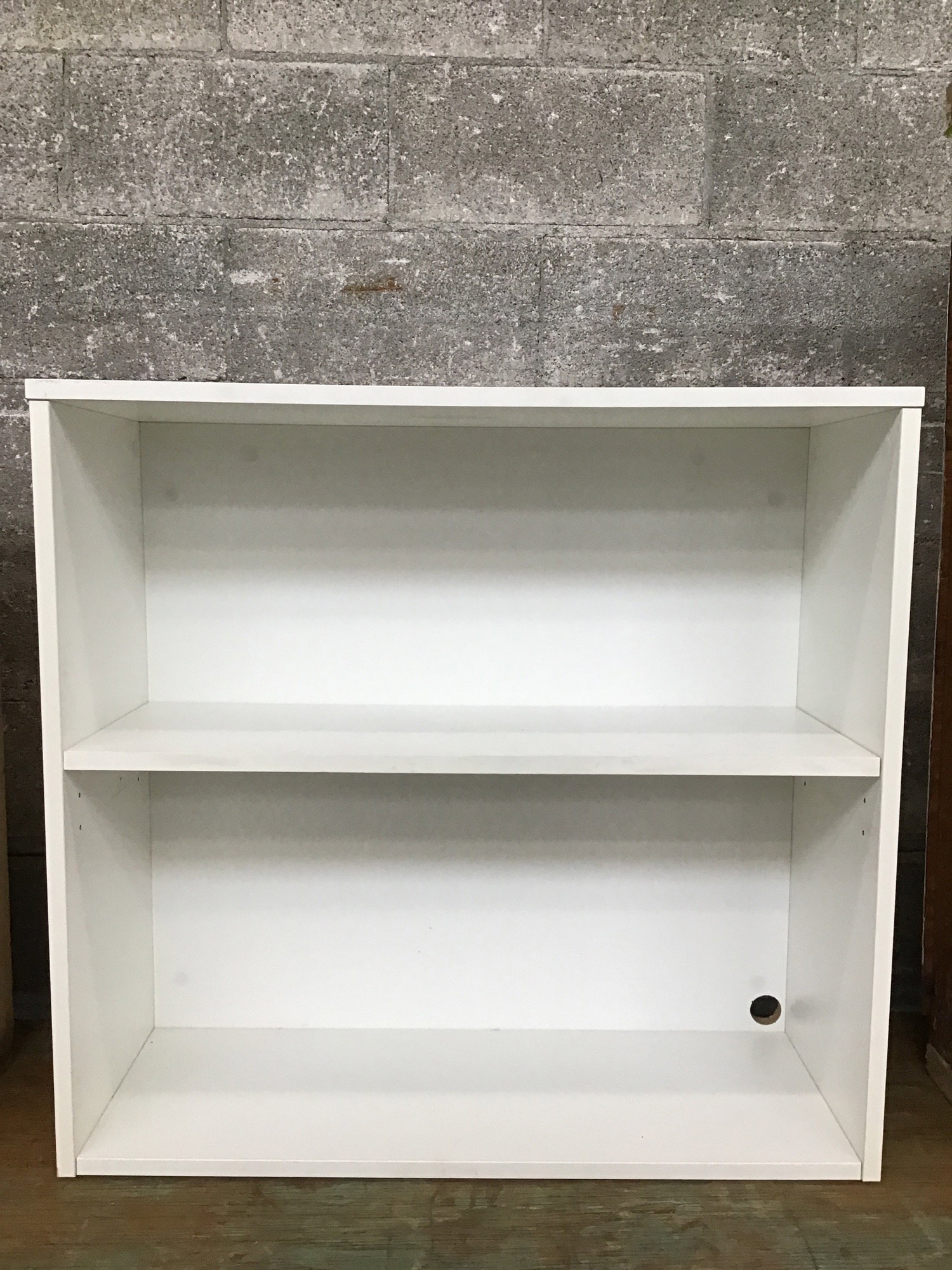 A small bookshelf with a white melamine finish and one shelf that's semi-adjustable within a few inches.