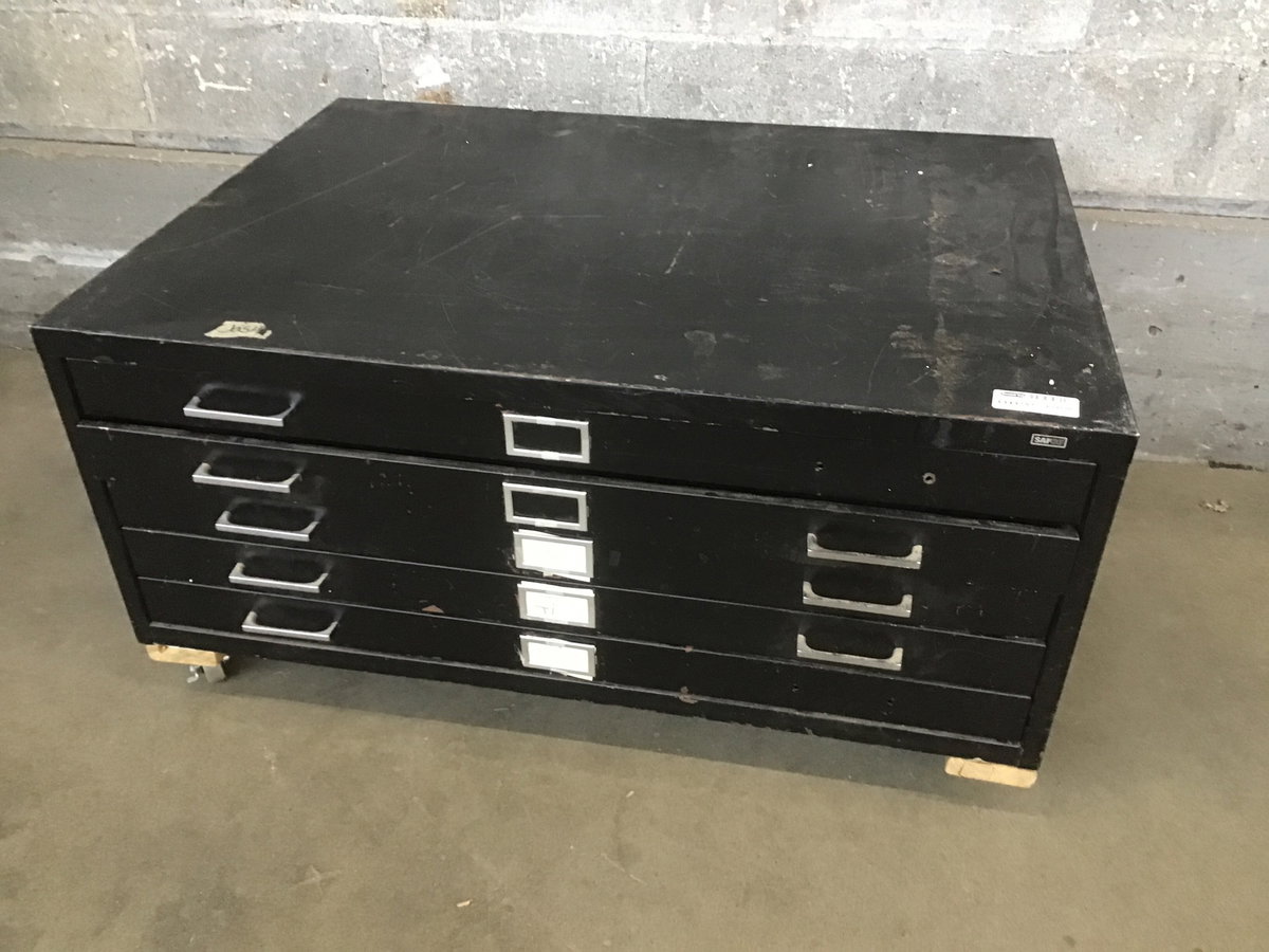 Metal flat file filing cabinet with five drawers. This versatile storage cab is clean, functional, and currently set up on lockable swivel casters.