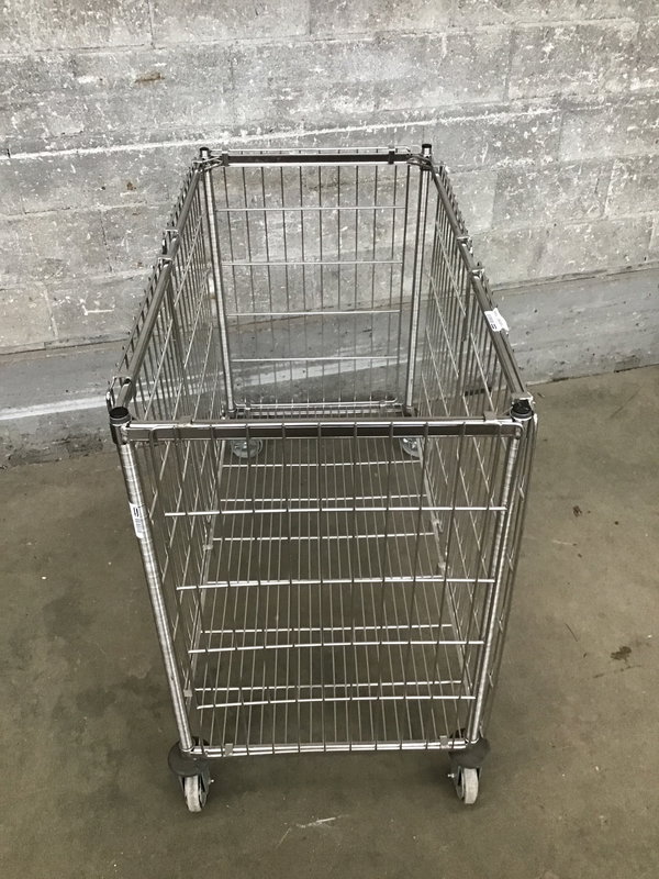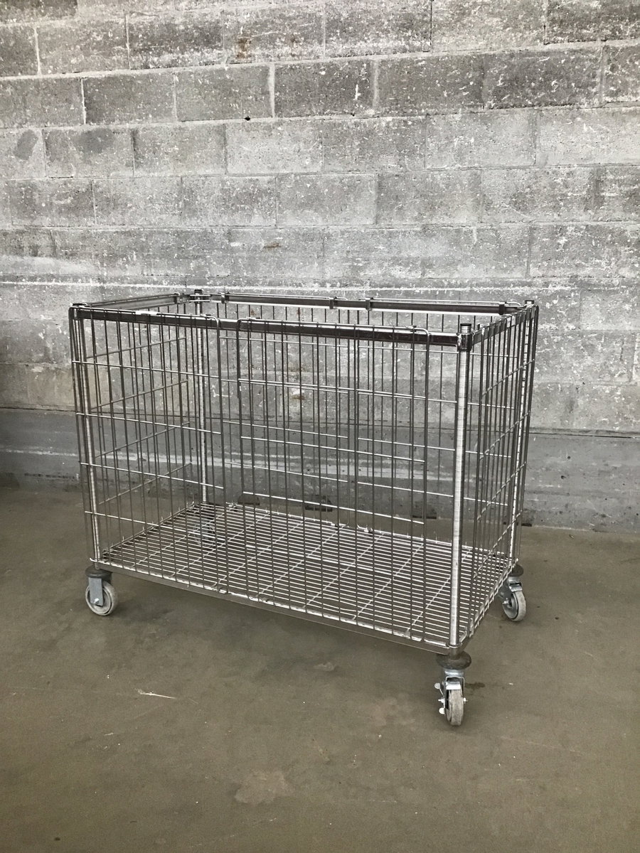 Rolling bin made out of Metro style wire shelving. The sides lift off the frame. Two casters swivel, and two are fixed. Great way to store your big rubber gym balls or bulky things.