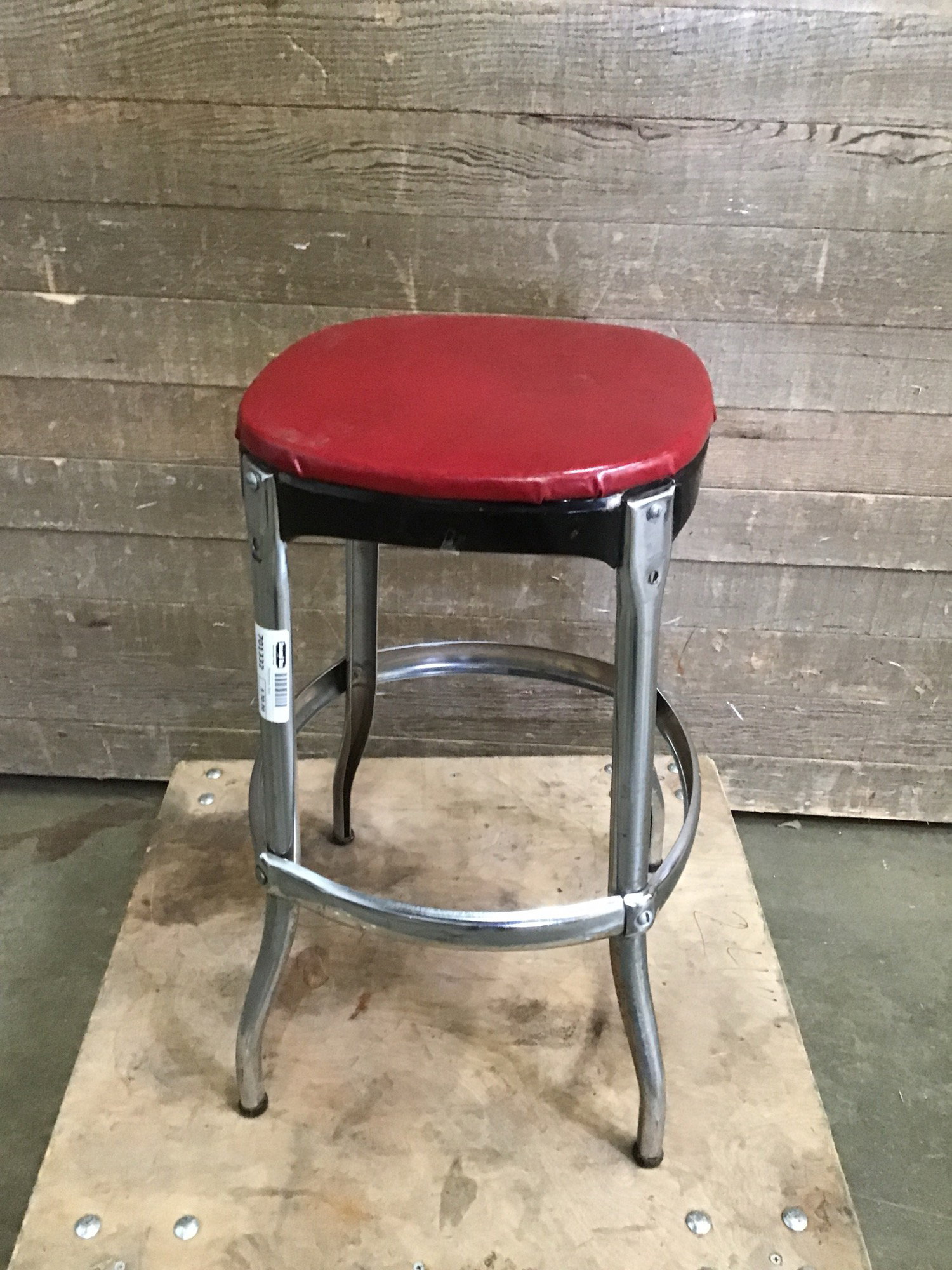 Sweet midcentury stool with cherry red seat and chrome legs.