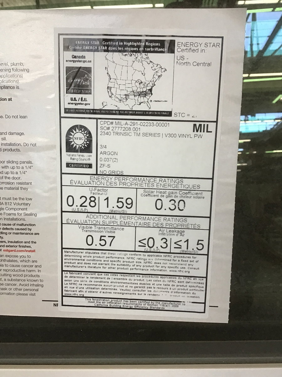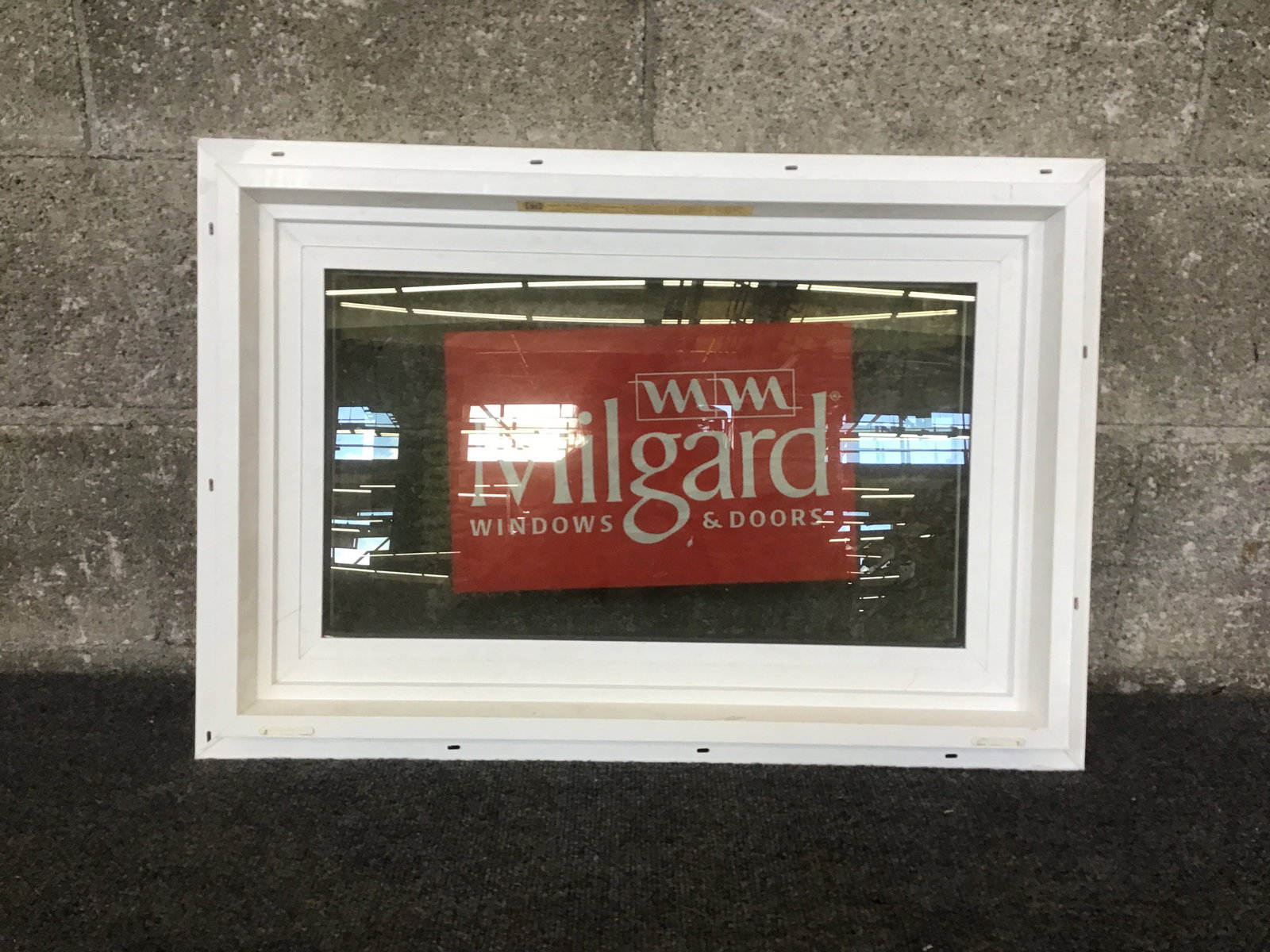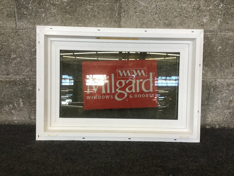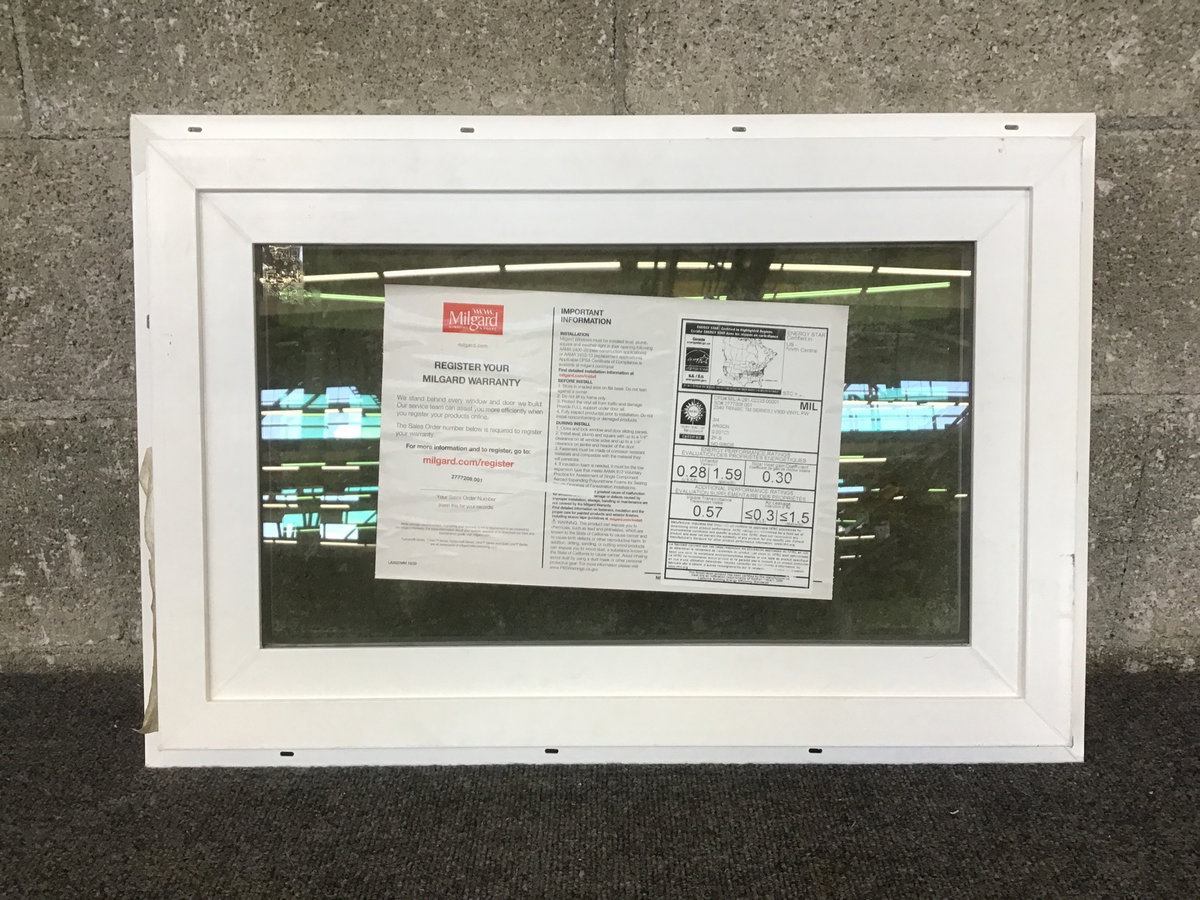 A white vinyl fixed window by Milgard. This window features thermopane glass, nailing fins, was made in 2022 and still has an energy tag attached. This would make for a good bathroom window or as a window for a below ground dwelling.