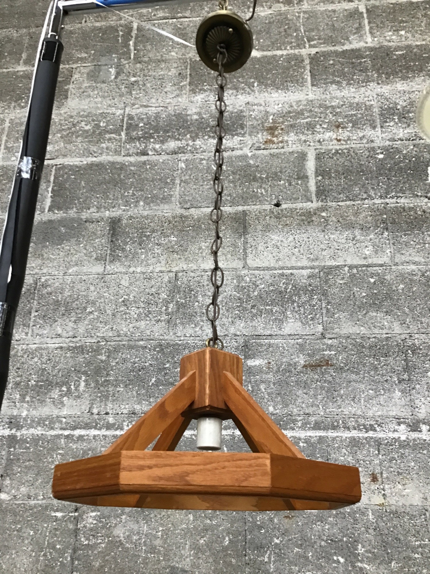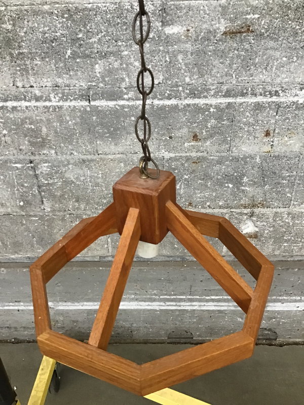 A cute and simple single bulb hanging light with a wood frame. It's a little 80s, and little Mission, a lot funky and fun! You could easily stain it a different shade or even give it a creative paint job to match your space.