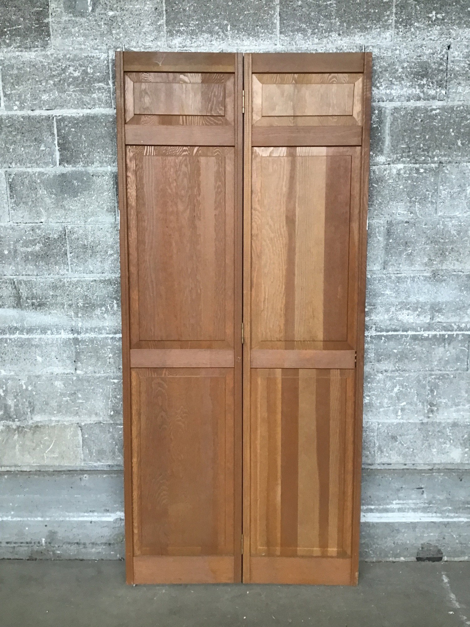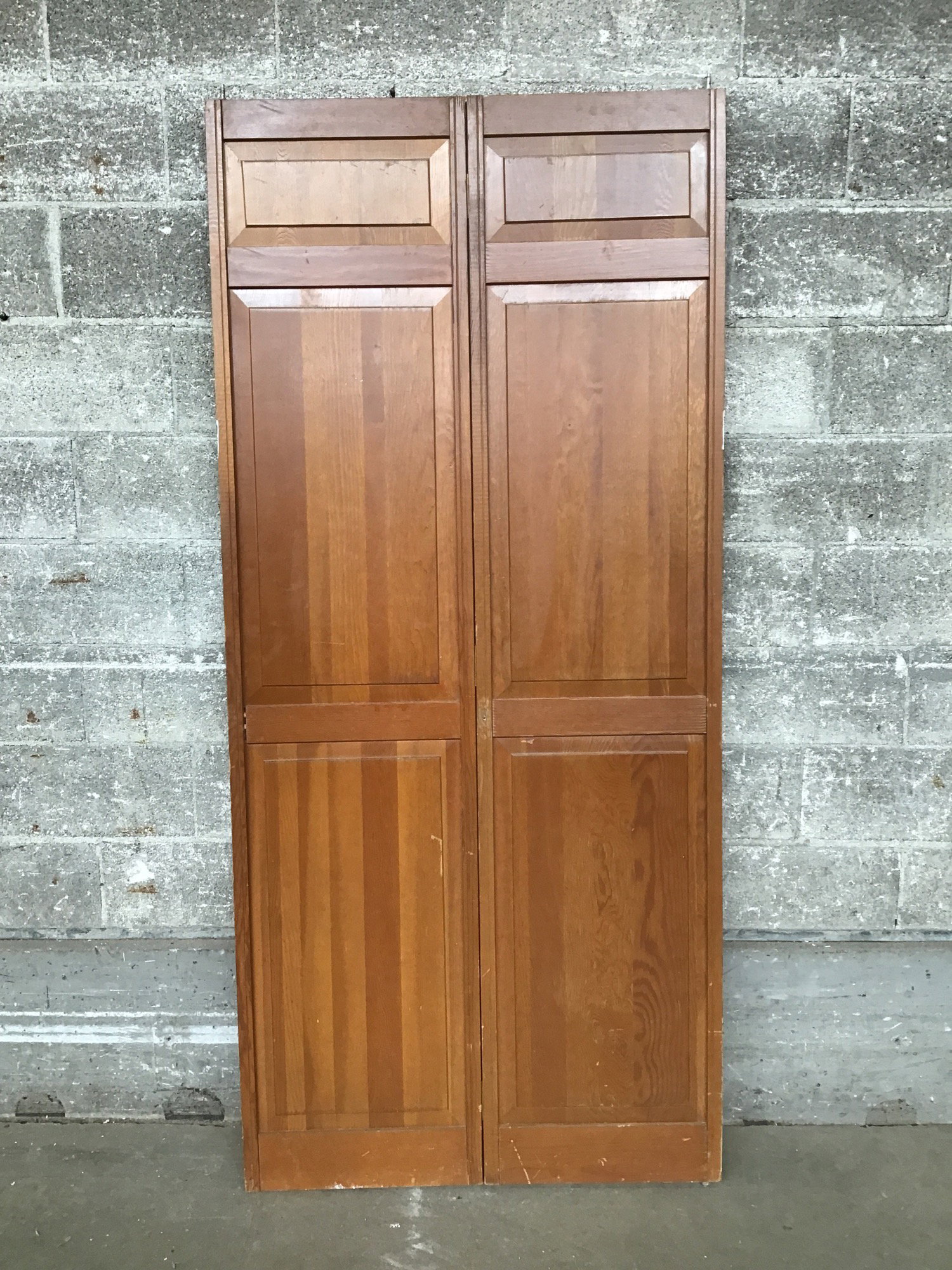 A three beveled panel bi-fold mixed grain fir door. This door showcases a mix of fir vertical and flat grain facing mixed throughout the material. This would make for a good closet or pantry door.