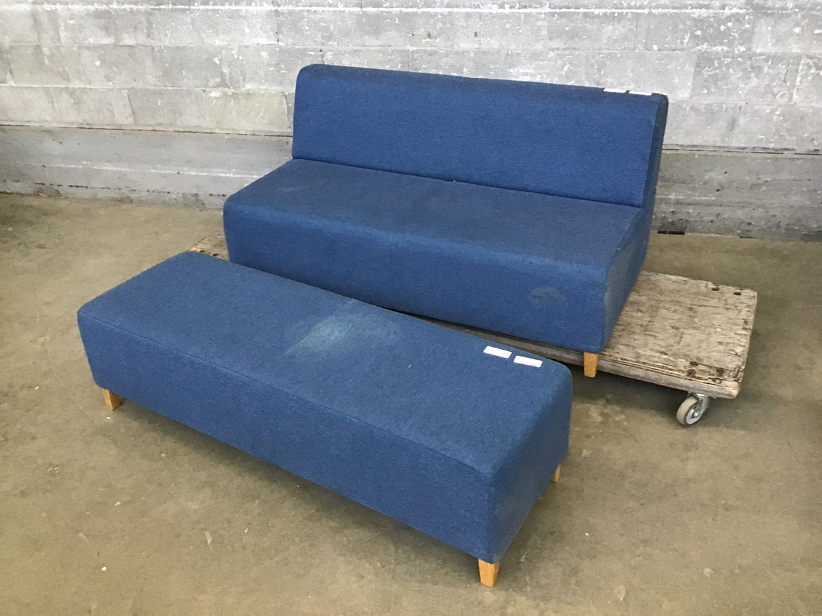 A contemporary 2-seater couch in denim blue with a matching ottoman. Excellent for a lobby, bar, or home where you don't want your guests to get too comfy by lounging against the arm of your sofa... It needs a good once over with an upholstery cleaner, but otherwise is in great shape!