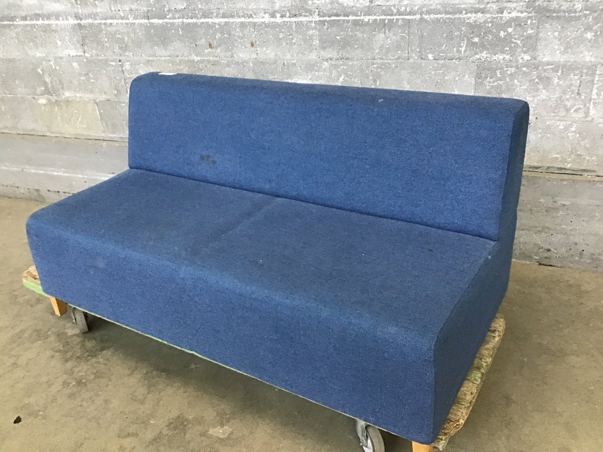 A contemporary 2-seater couch in denim blue. Excellent for a lobby, bar, or home where you don't want your guests to get too comfy by lounging against the arm of your sofa... It needs a good once over with an upholstery cleaner, but otherwise is in great shape!