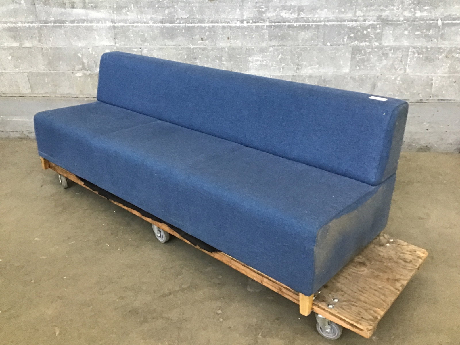 A contemporary 2-seater couch in denim blue. Excellent for a lobby, bar, or home where you don't want your guests to get too comfy by lounging against the arm of your sofa... It needs a good once over with an upholstery cleaner, but otherwise is in great shape!