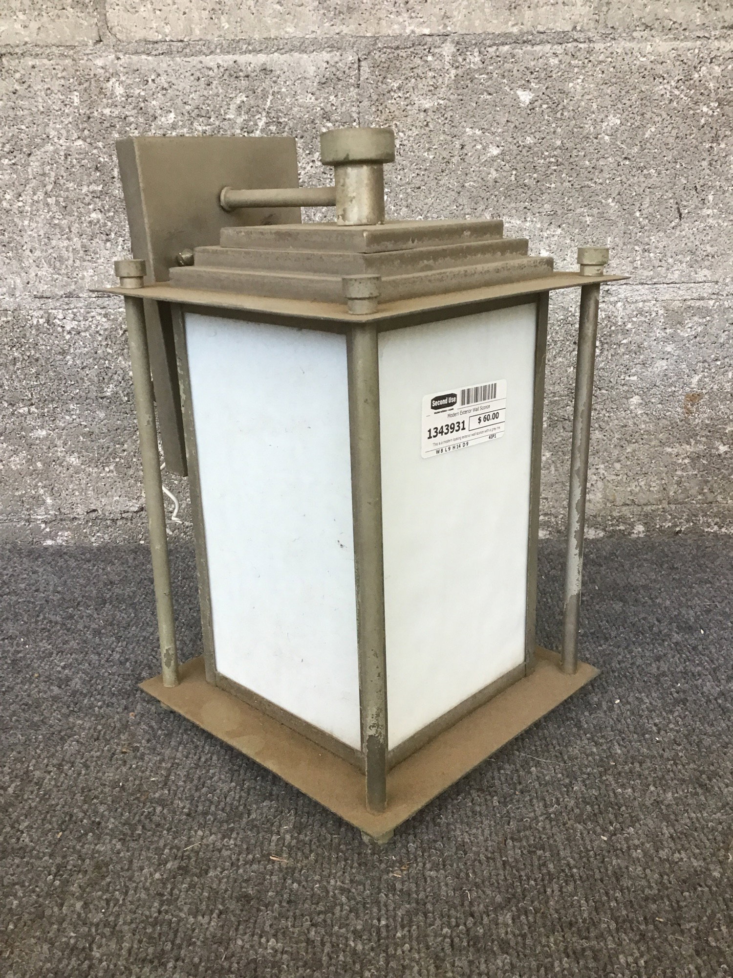 This is a modern looking exterior wall sconce with a grey metal frame and milk white opaque glass surrounding the bulbs. Holds three small candle style bulbs.
